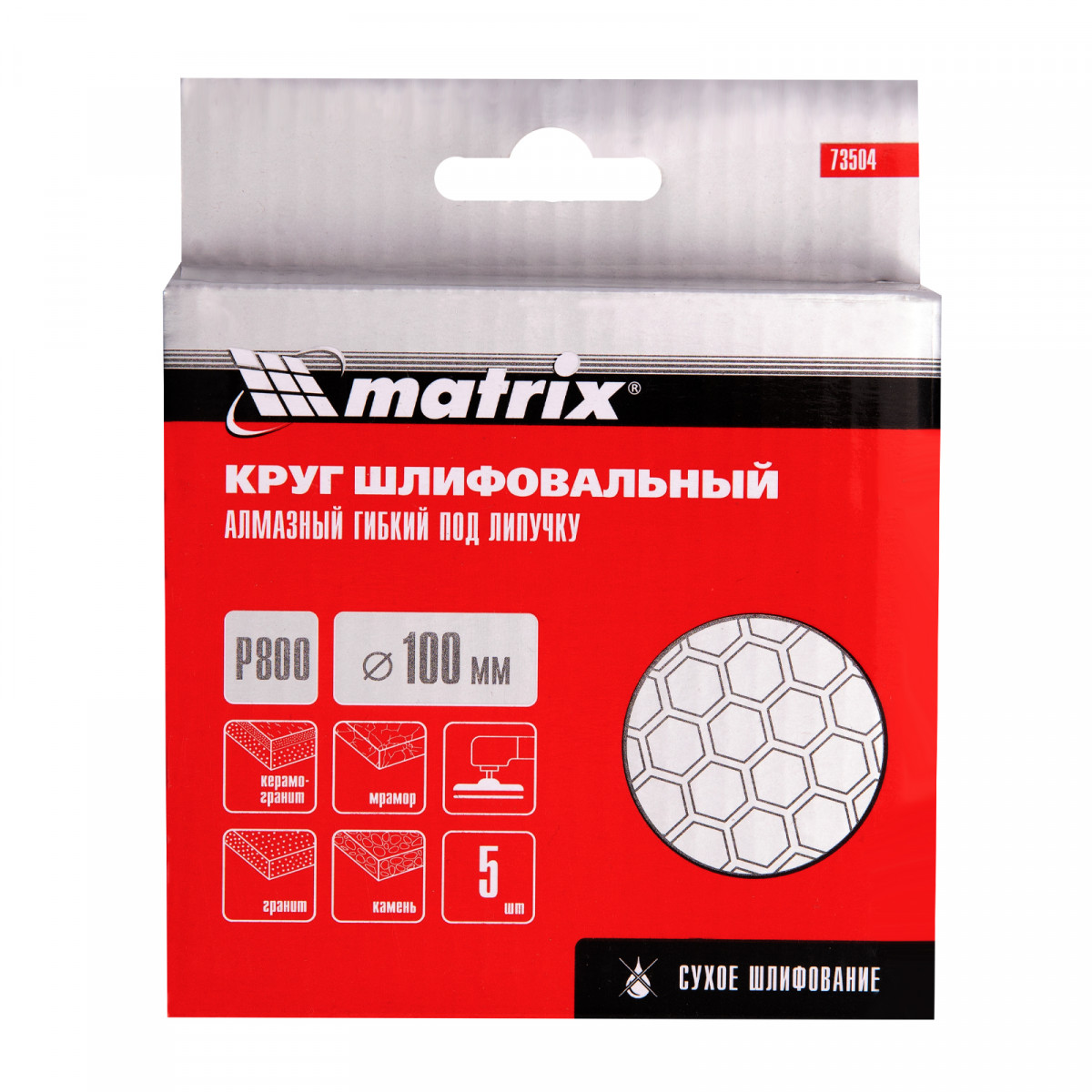 Алмазный гибкий шлифовальный круг Matrix 73504 диаметром 100 мм, с зернистостью P 800, 5 шт. в упаковке, предназначен для сухого шлифования гранита, мрамора, природного и искусственного камня, керамогранита. Используется преимущественно на цветных и черных поверхностях. Абразив с зернистостью P 800 снимает тонкий слой материала и применяется для чистового шлифования. Гибкий круг удобен для обработки предметов сложной формы. Оснастка используется на УШМ с установленной опорной тарелкой для АГШК.