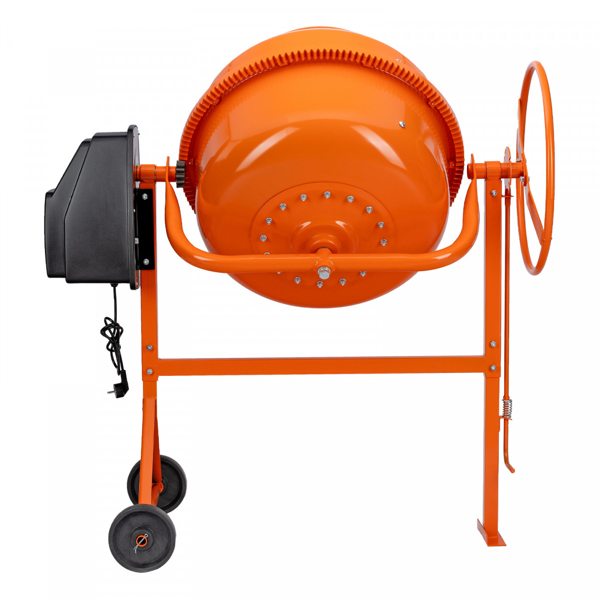 - Удобная загрузка и выгрузка смеси — барабан наклоняется при помощи маховика и легко фиксируется в нужном положении.