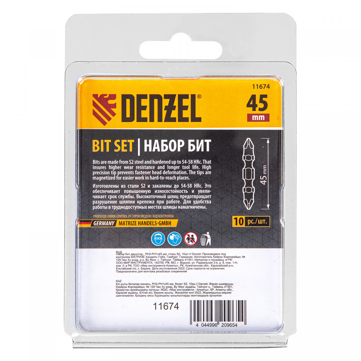Бита двухсторонняя, PH2-PH1 х 45 мм, сталь S2, 10 шт. Denzel