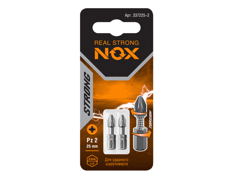Торсионная бита NOX STRONG – профессиональная бита c повышенным ресурсом и износостойкостью. Предназначена для использования с электроинструментом в ударном режиме.Тип шлица PH2, длина 25 мм.Изготовлены из легированной стали марки S2, обладающей повышенной прочностью и износостойкостью за счёт пружинных свойств. Твёрдость стали по шкале Роквелла 58-62 HRC.Шестигранный хвостовик ¼ HEX исключает проскальзывание оснастки в патроне электроинструмента.Биты NOX изготовлены методом фрезеровки , что обеспечивает точность формы биты в соответствии со стандартом DIN и гарантирует высокий ресурс биты.Подходит для работы электродрелью со стандартным трёхкулачковым зажимным патроном и шуруповёртом с шестигранным патроном для быстрой смены насадки.