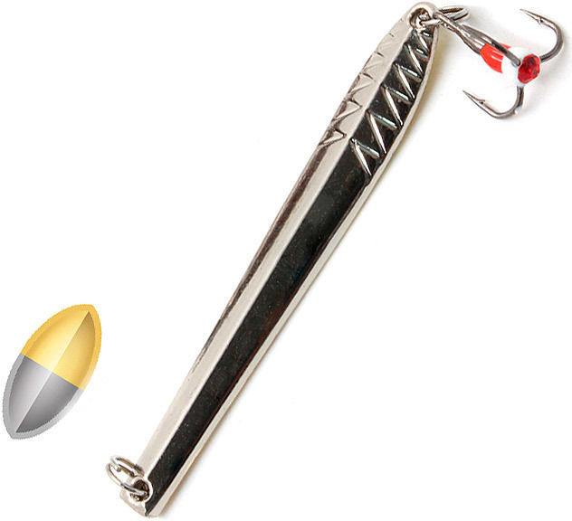 У блесны узкая вытянутая пластина, в лицевой части чуть изогнутая. Такая форма обуславливает соблазнительную выразительную игру: приманка красиво покачивается и отклоняется в сторону от вертикали на подбросах различной интенсивности. Блестящая поверхность пластины при попадании света заманчиво бликует. Спереди в нижней части есть фигурное рифление.