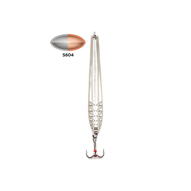 У блесны узкая вытянутая пластина, в лицевой части чуть изогнутая. Такая форма обуславливает соблазнительную выразительную игру: приманка красиво покачивается и отклоняется в сторону от вертикали на подбросах различной интенсивности. Блестящая поверхность пластины при попадании света заманчиво бликует. Спереди в нижней части есть фигурное рифление.