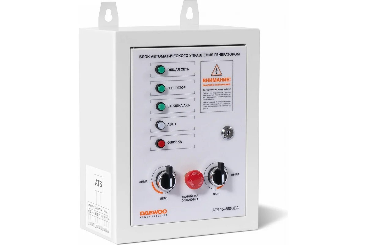 Блок DAEWOO ATS15-380GDA обеспечивает автоматический запуск бензиновых генераторов DAEWOO GDA 7500E-3, GDA 7800E-3 в случае падения напряжения в основной сети или прекращения подачи электроэнергии.