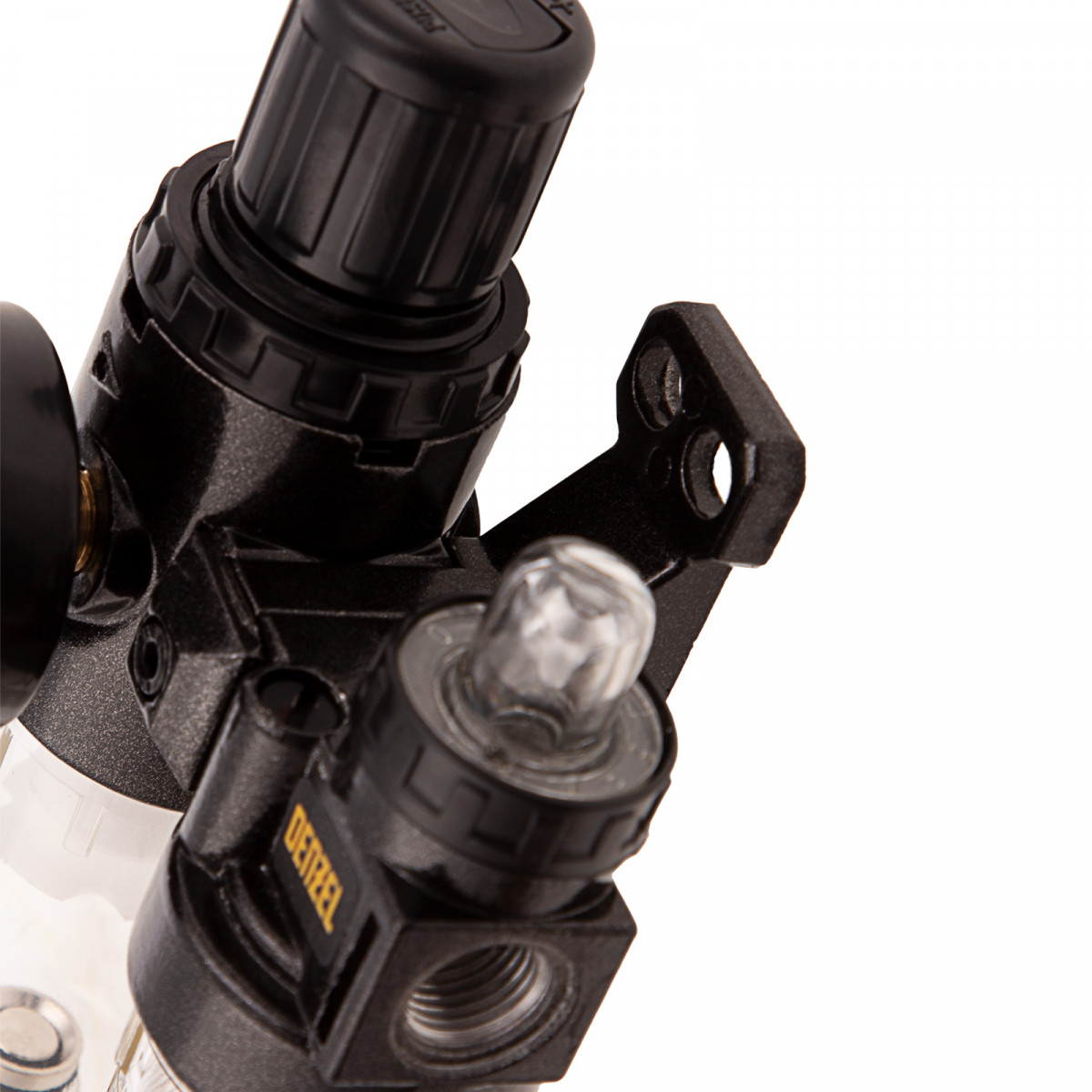 Блок подготовки воздуха Denzel FLR1500 57469 с фильтром-влагоотделителем, регулятором и лубрикатором, с присоединительным размером 1/4 дюйма, имеет пропускную способность 1500 л/мин, работает под давлением до 10 бар и позволяет увеличить срок службы пневматического инструмента.,Регулятор со встроенным манометром помогает контролировать и поддерживать заданное давление для корректной работы пневмоинструмента. Фильтр предназначен для очистки сжатого воздуха от конденсата и посторонних частиц размером от 40 мкм. Лубрикатор служит для подачи масла к пневмоинструменту. Блок используется совместно с компрессорами на строительной площадке, в мастерской, на производстве, в автосервисе, пригодится также в гараже.