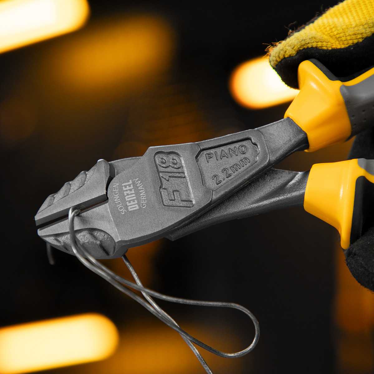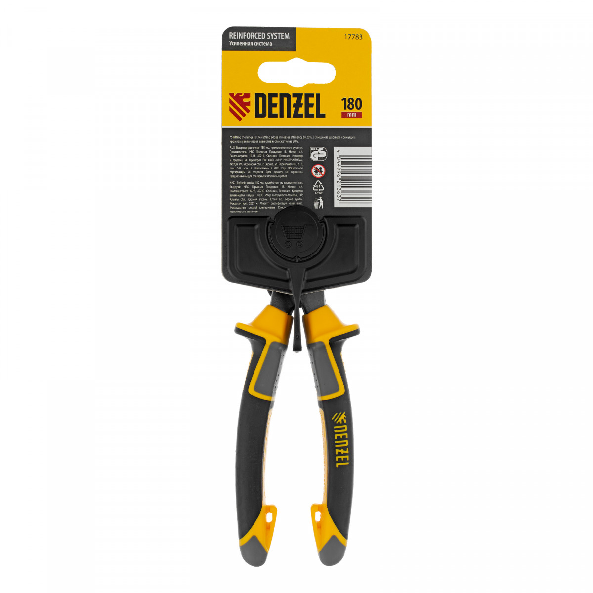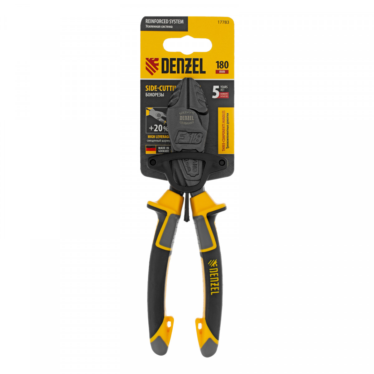 Усиленные бокорезы Denzel 17583 длиной 180 мм, с трехкомпонентными рукоятками, предназначены для разрезания кабелей, проводов, гвоздей и проволоки средней (750 Н/мм2) и высокой жесткости (1800 Н/мм2) диаметром 3,7 и 2,6 мм соответственно. Подходят для резки рояльных струн (предел прочности 2300 Н/мм2) диаметром до 2,2 мм. Успешно справляются не только с медными, алюминиевыми и пластмассовыми деталями, но и с более жесткими стальными элементами. Встроенный рычажный механизм и смещенный непосредственно к режущим кромкам шарнир увеличивают усилие реза на 20%.