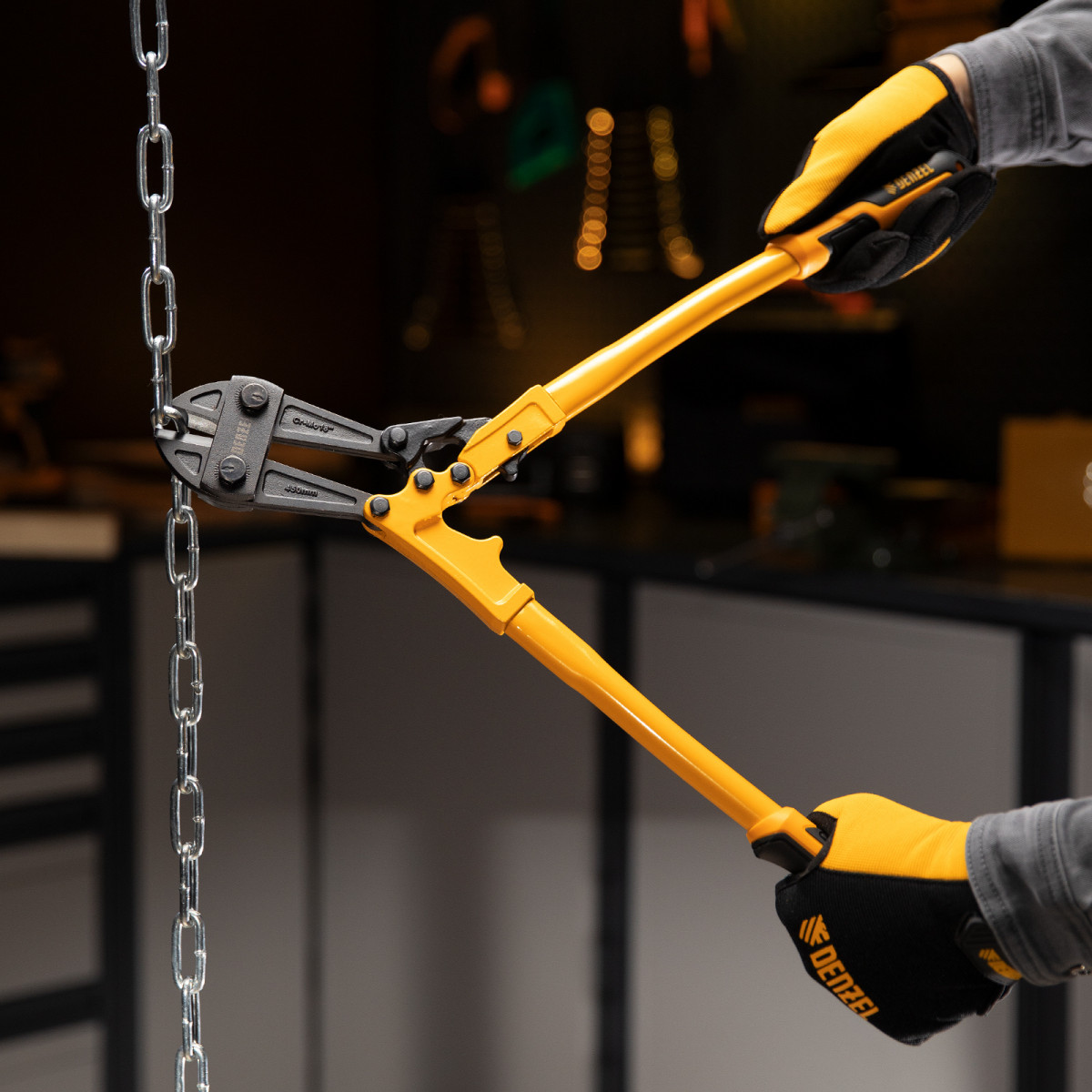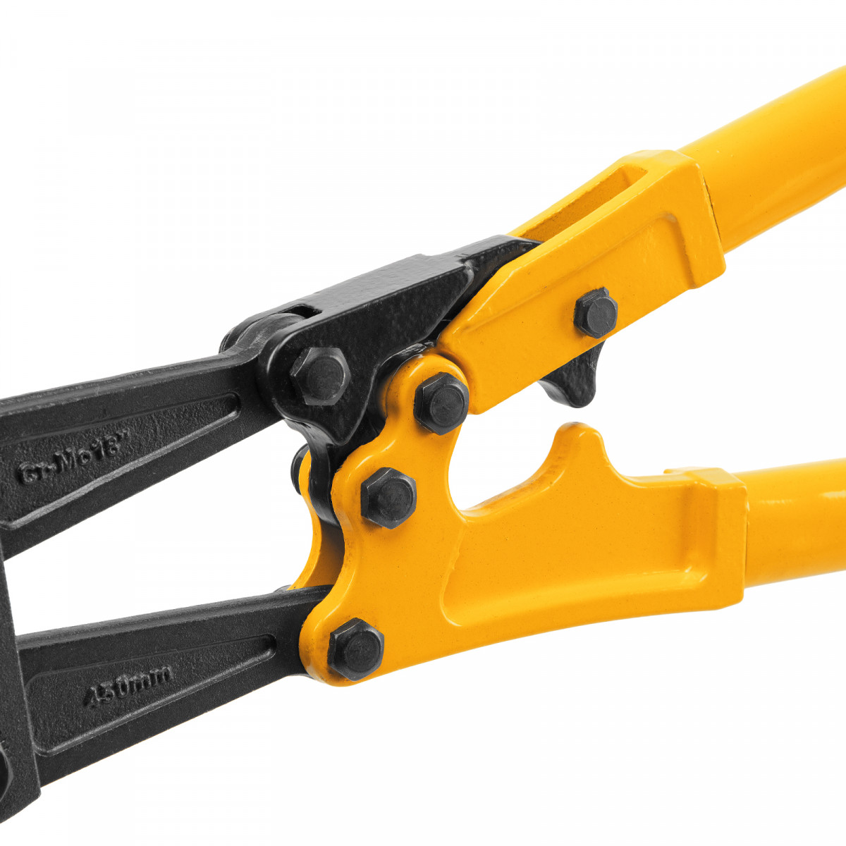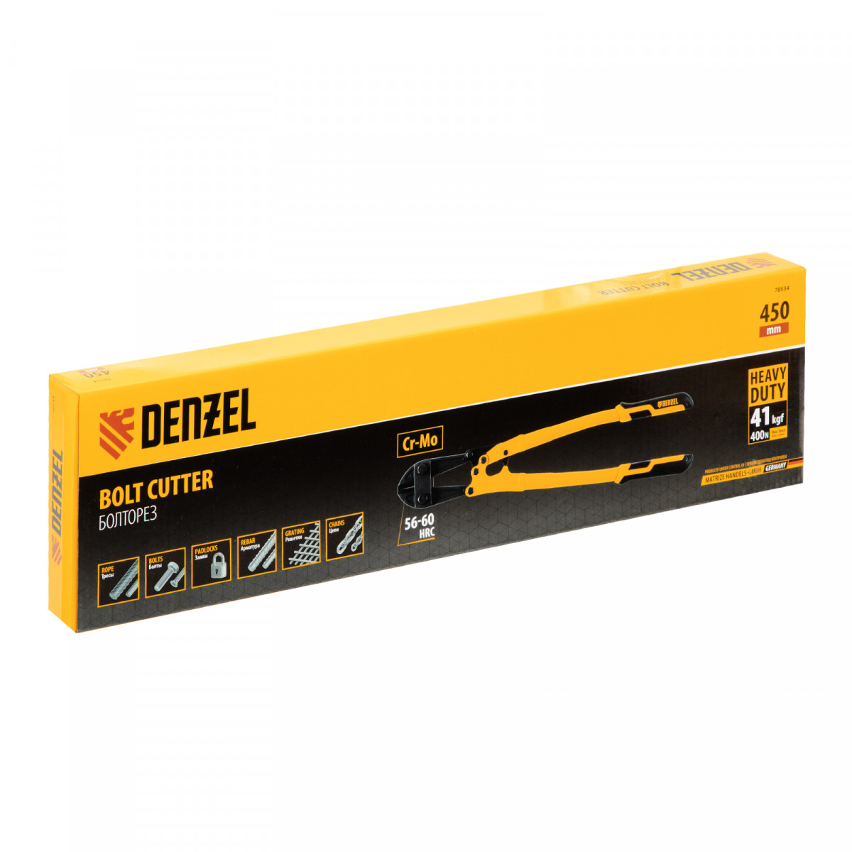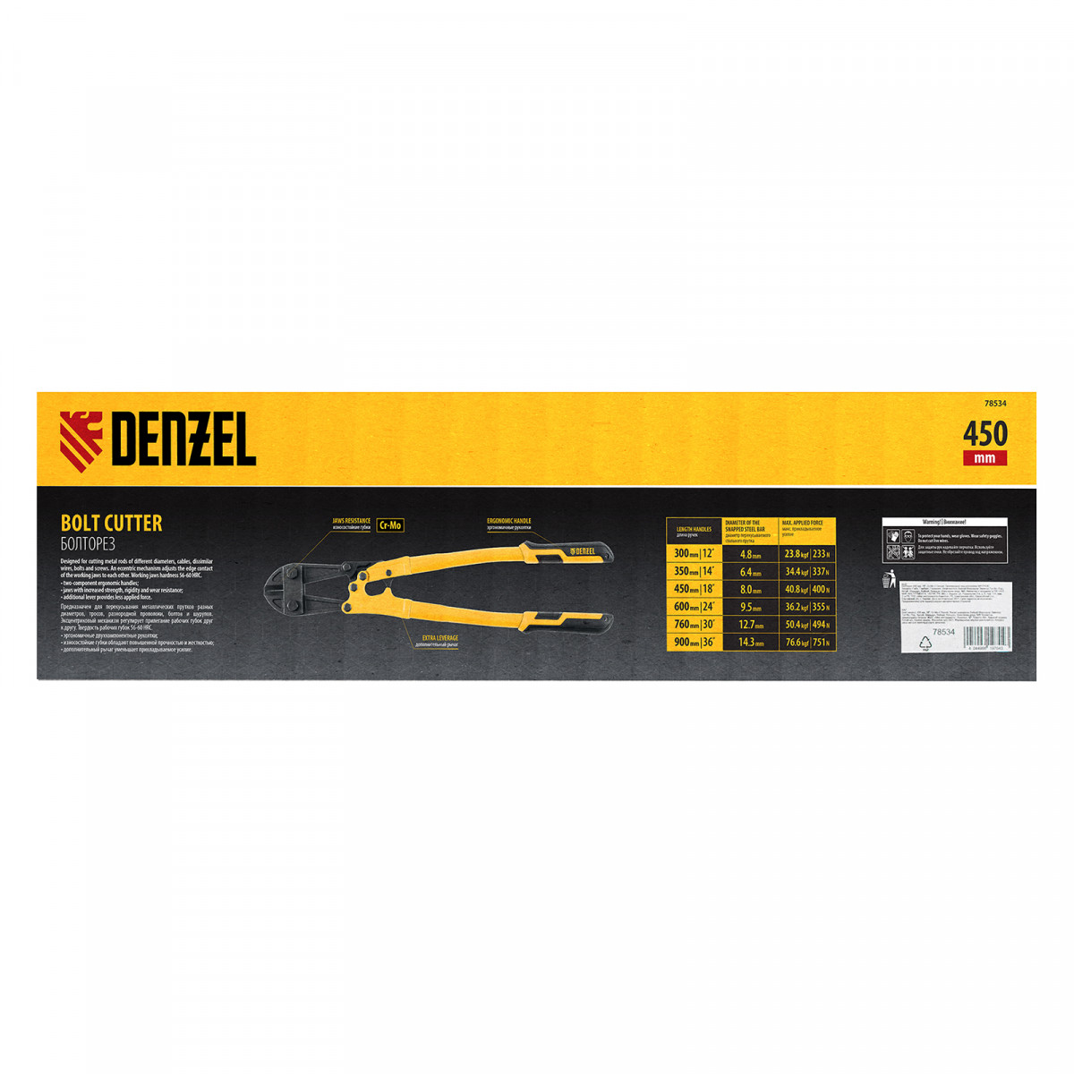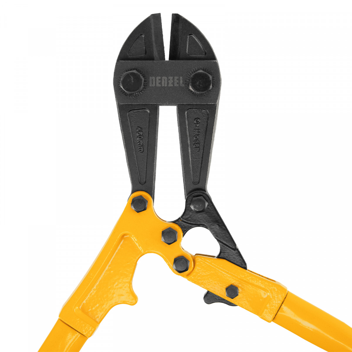 Болторез Denzel 78534 длиной 450 мм (18 дюймов), из стали Cr-Mo, предназначен для перекусывания стальных прутков диаметром 8 мм, болтов и шурупов, тросов, разнородной проволоки.