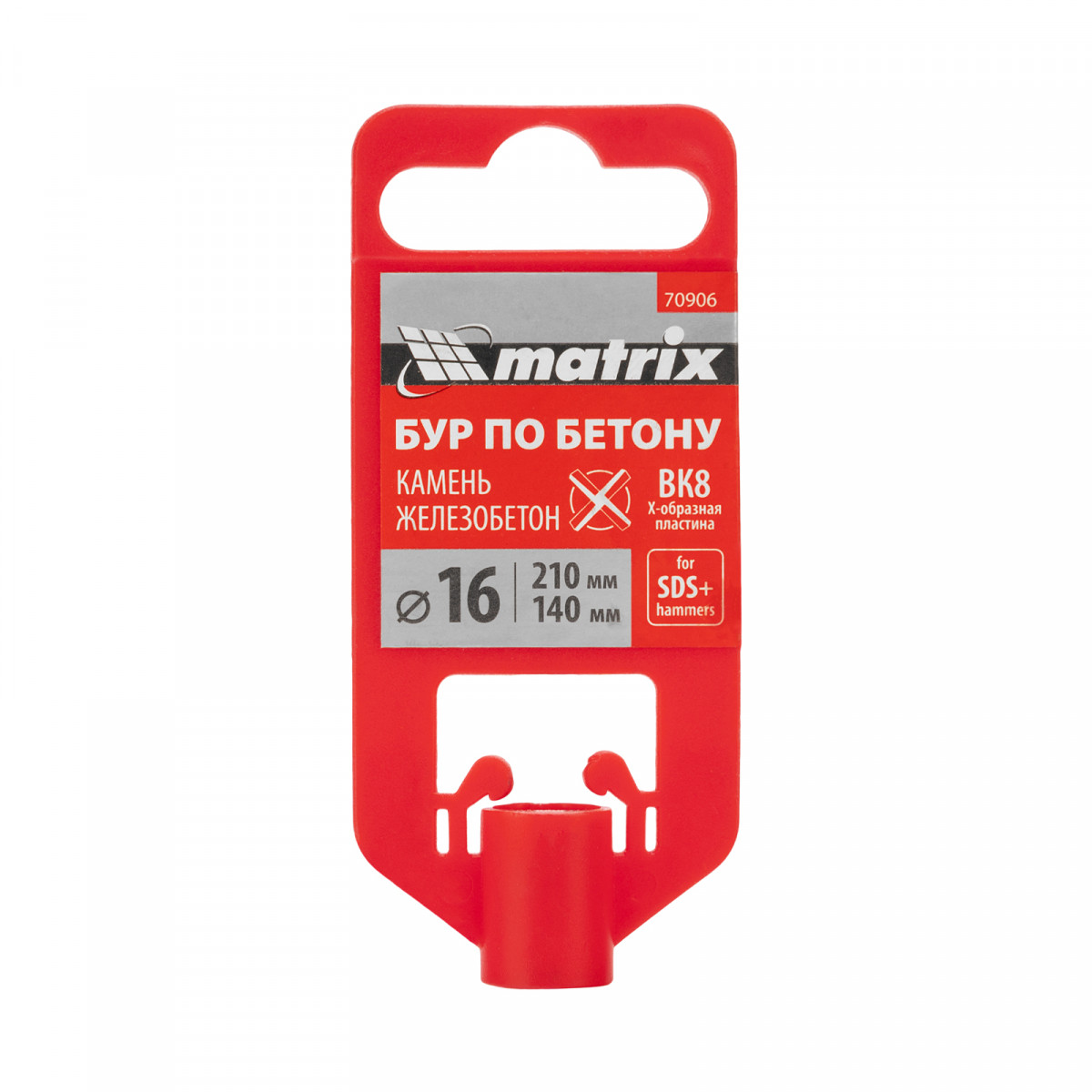 Бур по бетону Matrix 70906 длиной 210 мм, с хвостовиком SDS-plus и крестовой пластиной, предназначен для получения отверстий диаметром 16 мм в бетоне, камне и кирпиче. Крестовая пластина обеспечивает эффективную работу с твердыми материалами, в том числе армированным бетоном. Бур устанавливается в патрон перфоратора и используется во время проведения строительных работ.