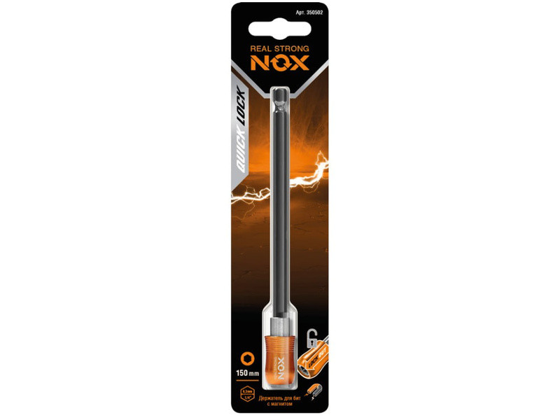 Магнитный держательNOXHOLDER предназначен для бит и другой оснастки. Длина 150 мм.Оснащён мощным неодимовым магнитом, облегчает работу и ускоряет процесс замены бит.Шестигранный хвостовик ¼ HEX исключает проскальзывание оснастки в патроне электроинструмента.Подходит для работы электродрелью со стандартным трёхкулачковым зажимным патроном и шуруповёртом с шестигранным патроном для быстрой смены насадки.