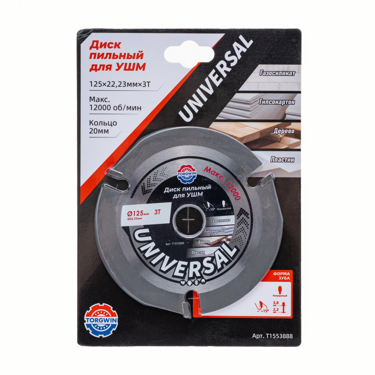Диск пильный ТРЕХЗУБЫЙ для УШМ, диаметр - 125 мм, посадка - 22.23 мм, количество зубов - 3 шт, толщина зуба - 3.75 мм, высота зуба - 11.06 мм, ширина зуба - 3 мм. Применяется для резки древесины, фанеры, ламината, паркетных досок, гипсокартона, ДВП, ДСП, газосиликата. Три зуба из карбида вольфрама особой формы обеспечивают плавную выборку древесины и ровный чистый рез. Диск разработан специально для высоких оборотов (до 12200 об | мин). Даже при продолжительной работе корпус диска не нагревается