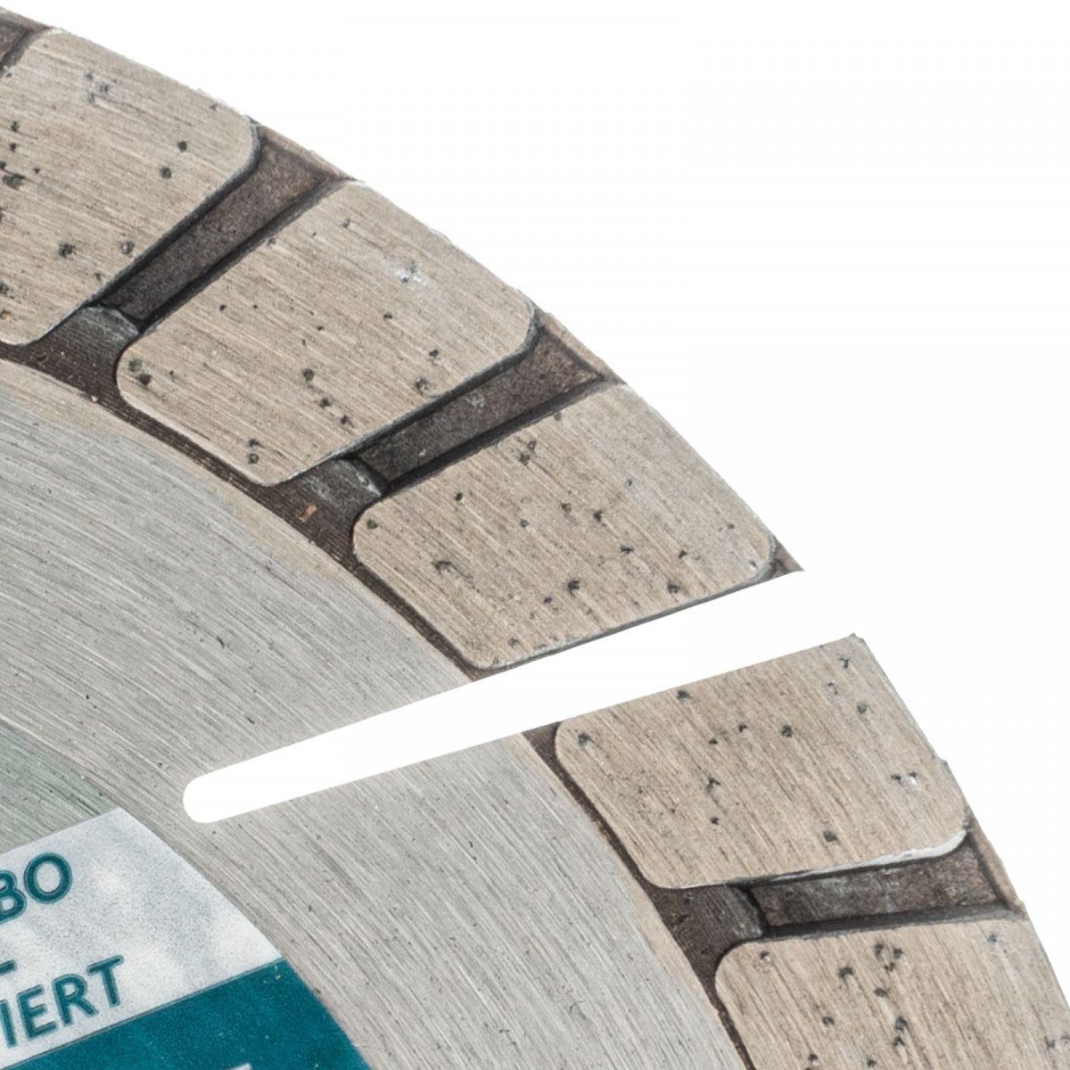 - Эффективная работа — благодаря турбо-сегментной форме диск быстро режет материалы, в т.ч. армированный бетон, водяное охлаждение не требуется.