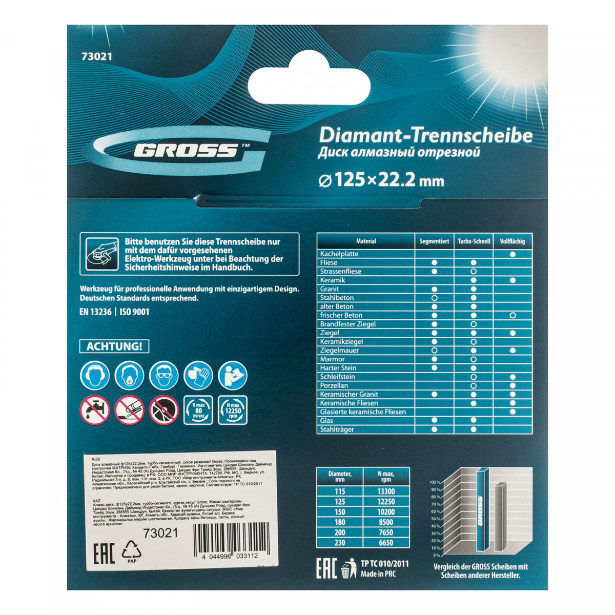 Алмазный турбо-сегментный диск Gross 73021 диаметром 125 х 22,2 мм для сухого резания — оснастка для УШМ со скоростью вращения до 12250 об/мин, предназначенная для отрезных работ. Универсальный диск с турбированной рабочей частью можно использовать для резки камня, гранита и кирпича, свежего бетона, а также слабоармированного железобетона. Он подходит для профессионального использования.