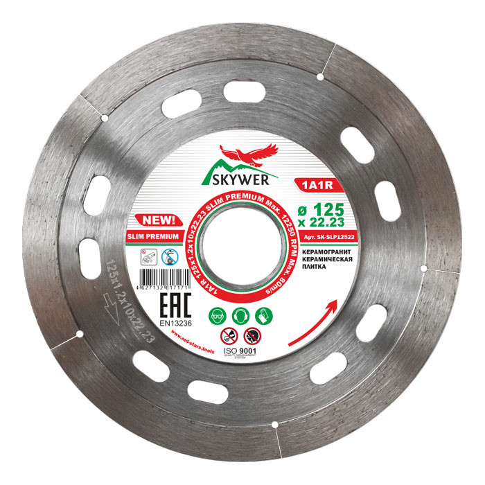 Круг алмазный 1A1R SLIM PREMIUM 125 х 1.2 х 10 х 22,23 от SKYWER - это ультратонкий алмазный диск используемый с керамической плиткой и керамогранитом. Высота алмазного слоя диска SLIM PREMIUM составляет 10 мм - что говорит о высоком ресурсе инструмента. Толщина реза всего 1,2 мм. Диск может использоваться без применения водяного охлаждения.