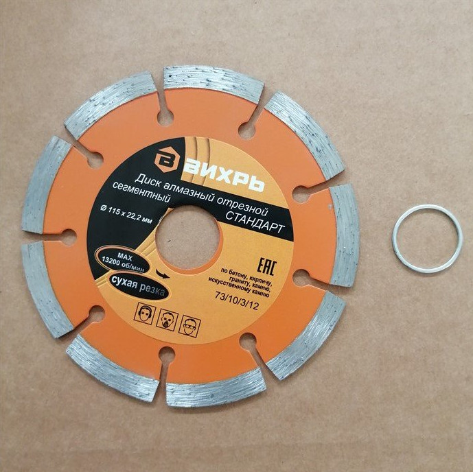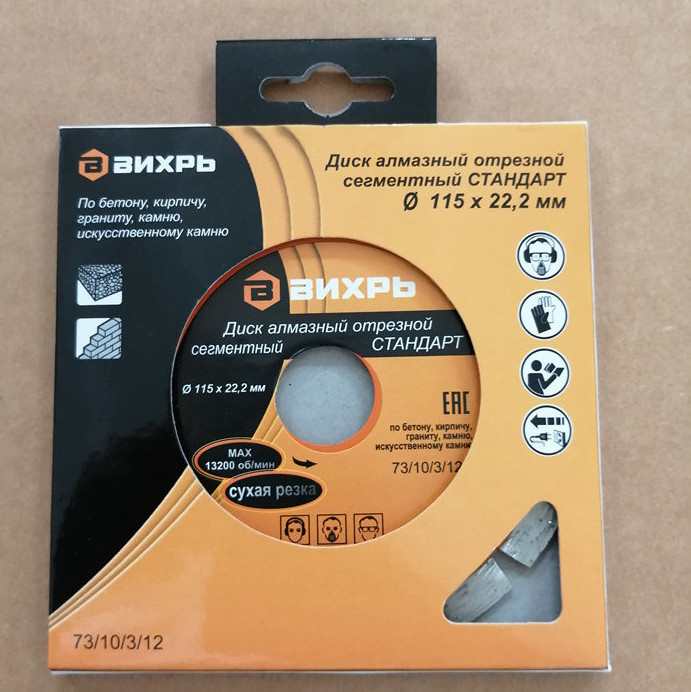 Диск алмазный отрезной сегментный СТАНДАРТ, 115 х 22,2 мм, сухая резка Вихрь - это алмазный отрезной диск, который используется совместно с угловыми шлифмашинами (болгарками) для сухой резки гранитных, бетонных, кирпичных и каменных изделий.