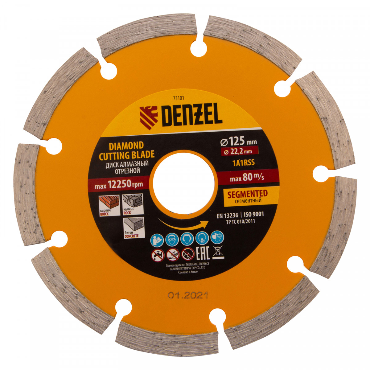 Отрезной сегментный алмазный диск Denzel 73101 диаметром 125 х 22,2 мм — оснастка для УШМ, использующаяся для сухой резки свежего и старого бетона, камня, кирпича, шлакоблока, мрамора, тротуарной плитки, гранита. Диск сегментного типа отличается высокой производительностью даже при интенсивных нагрузках. Подходит для бытового и профессионального использования.