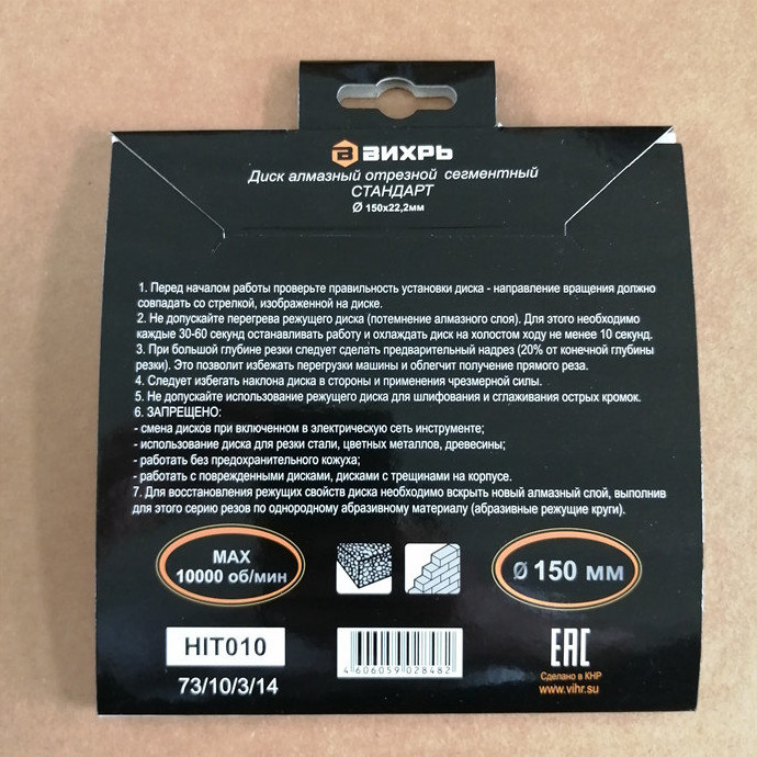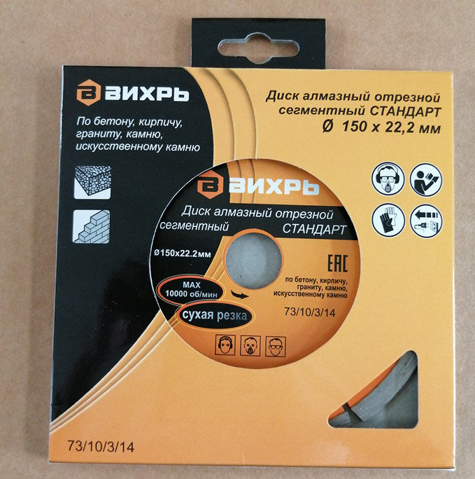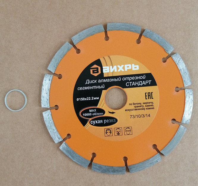 Диск алмазный отрезной сегментный СТАНДАРТ, 150 х 22,2 мм, сухая резка Вихрь - это алмазный отрезной диск, который используется совместно с угловыми шлифмашинами (болгарками) для сухой резки гранитных, бетонных, кирпичных и каменных изделий.