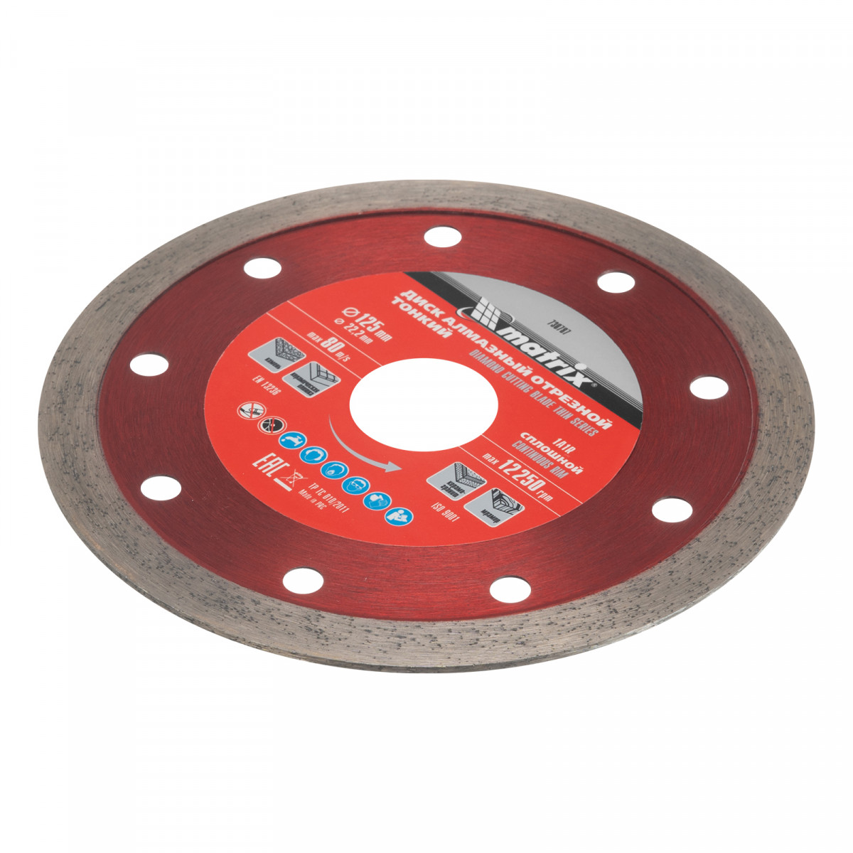 Отрезной сплошной алмазный диск Matrix ф125х22,2 мм 730787, тонкий, обеспечивает мокрое резание плотных материалов: керамогранита, керамической и кафельной плитки, мрамора, натурального и искусственного камня. Он устанавливается на УШМ или плиткорезы и используется с применением водяного охлаждения. Диск увеличивает производительность на 20% благодаря небольшой толщине 1,5 мм и снижению нагрузки на инструмент.