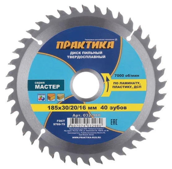 Диск пильный 185*30/20/16 мм 40 зубов по ламинату, пластику, ДСП "Практика"