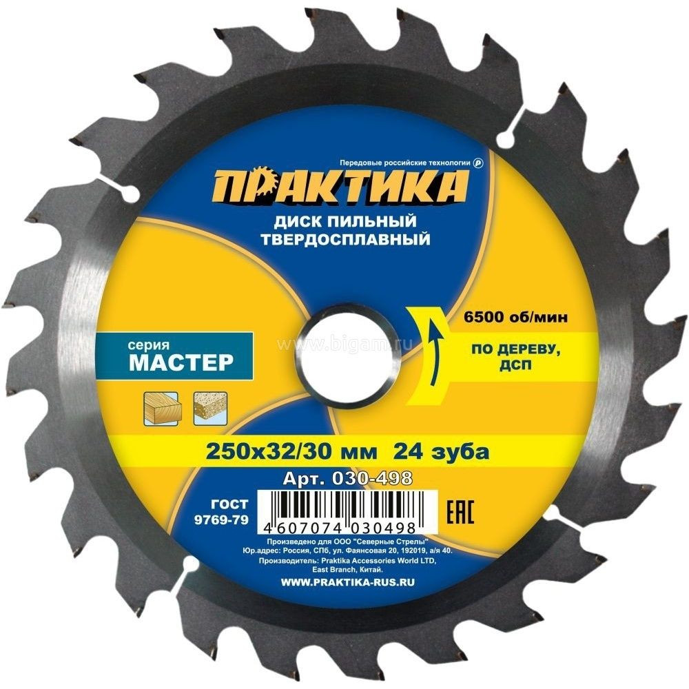Диск пильный 250*32/30 мм 24 зуба по дереву, ДСП "Практика"
