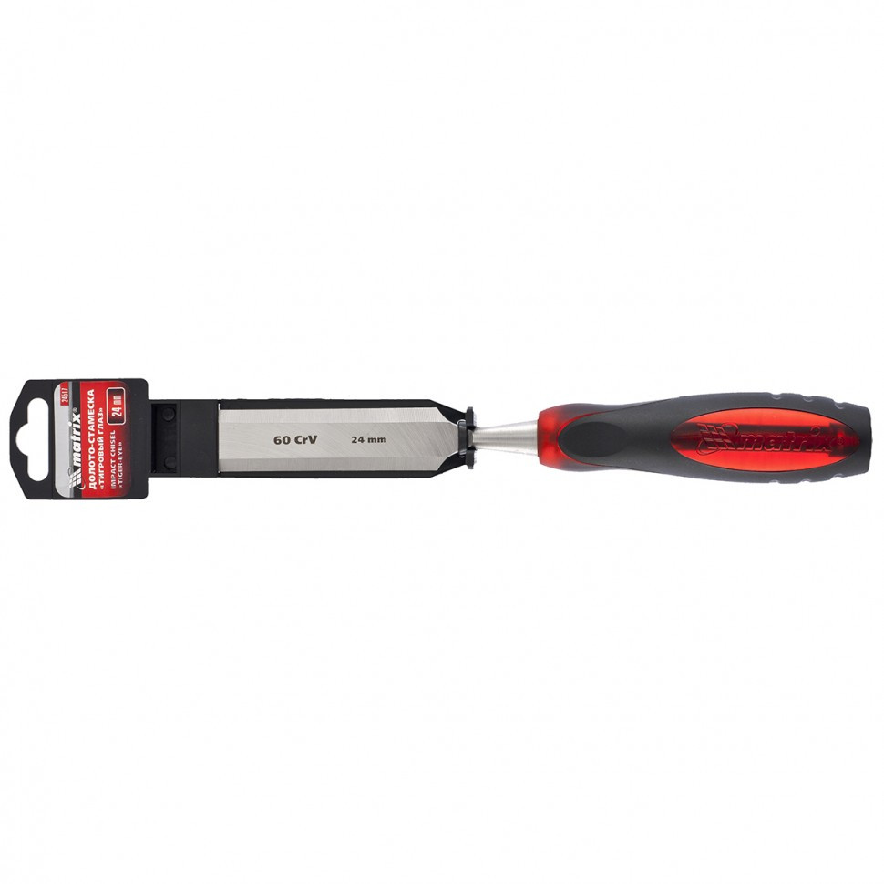 Долото-стамеска Matrix «Тигровый глаз» 24517 с полотном шириной 24 мм и двухкомпонентной обрезиненной рукояткой используется в столярном и плотницком деле, в производстве мебели. Позволяет вырезать углубления, формировать пазы, зачищать шипы и гнезда, снимать фаски. Инструмент выдерживает удары киянкой или молотком, т. к. металлический затыльник защищает его от деформации. Долото относится к профессиональному ручному инструменту, но может применяться и в домашних условиях.