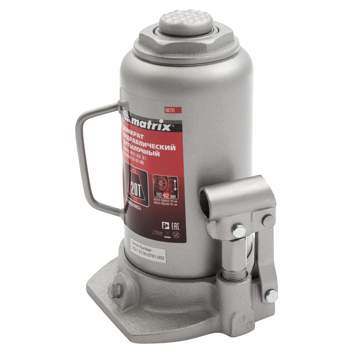 Домкрат гидравлический бутылочный Matrix 50731 используется для поднятия грузов массой до 20 т на высоту 242-452 мм. Подходит для автомобилей с высоким клиренсом. Домкрат будет полезен автолюбителям в гараже и дороге, а также сотрудникам СТО.