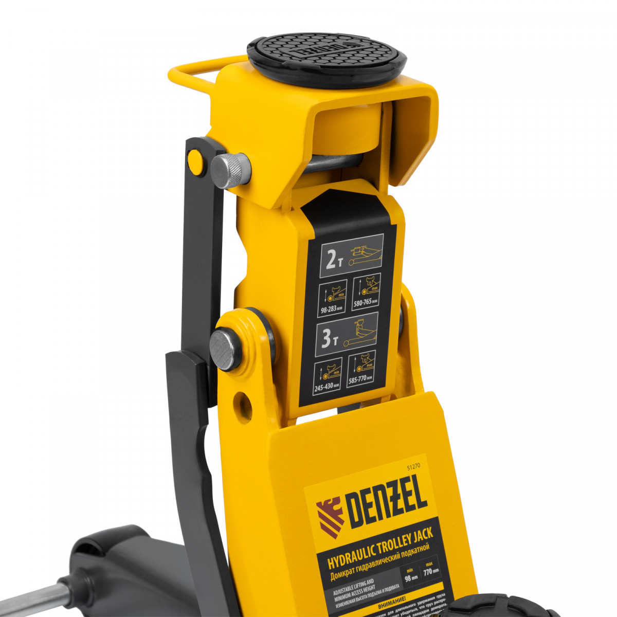 Профессиональный подкатной гидравлический домкрат Denzel 51270 с низким подхватом используется для быстрого подъема на высоту 98-770 мм всех типов автомобилей с любым клиренсом и массой до 2-3 т, в том числе SUV (внедорожников). Регулируемая проставка позволяет менять высоту подхвата и подъема, а также максимальную грузоподъемность. Высота подъема до 770 мм позволяет без труда обслуживать автомобили с высоким клиренсом, такие как рамные внедорожники, например, Dodge RAM, Ford Raptor и т.д.