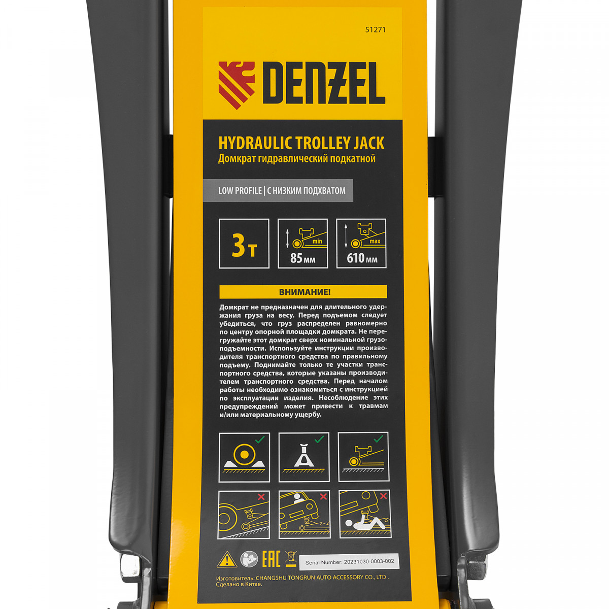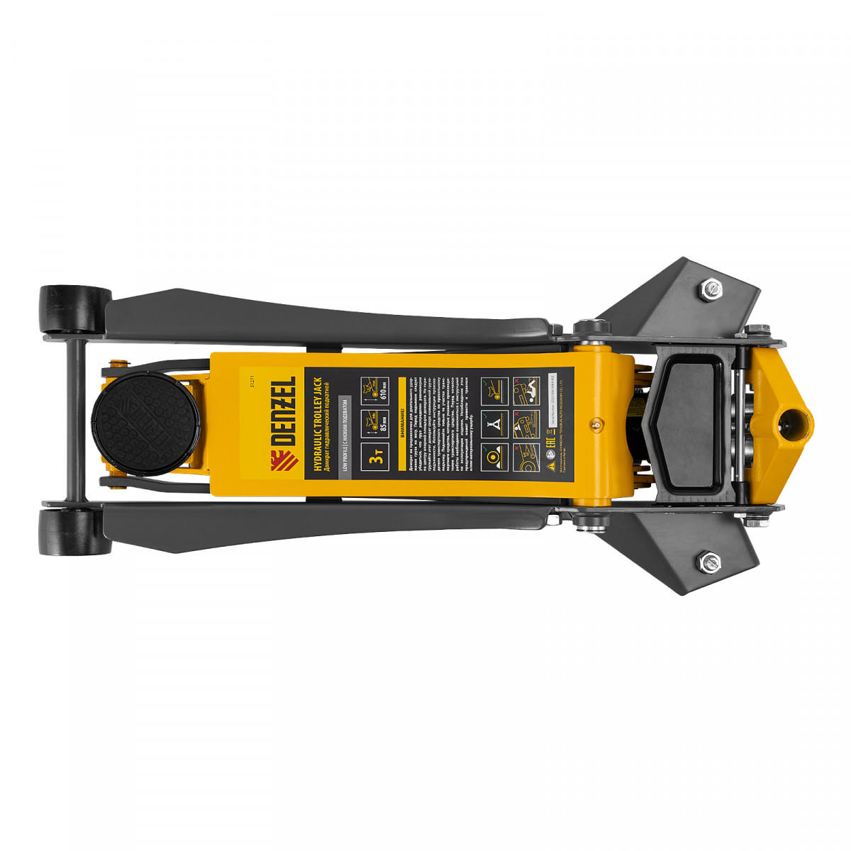 Домкрат гидравлический подкатной, 3 т, 85-610 мм, быстрый подъем, низ. подхват, проф, SUV Denzel