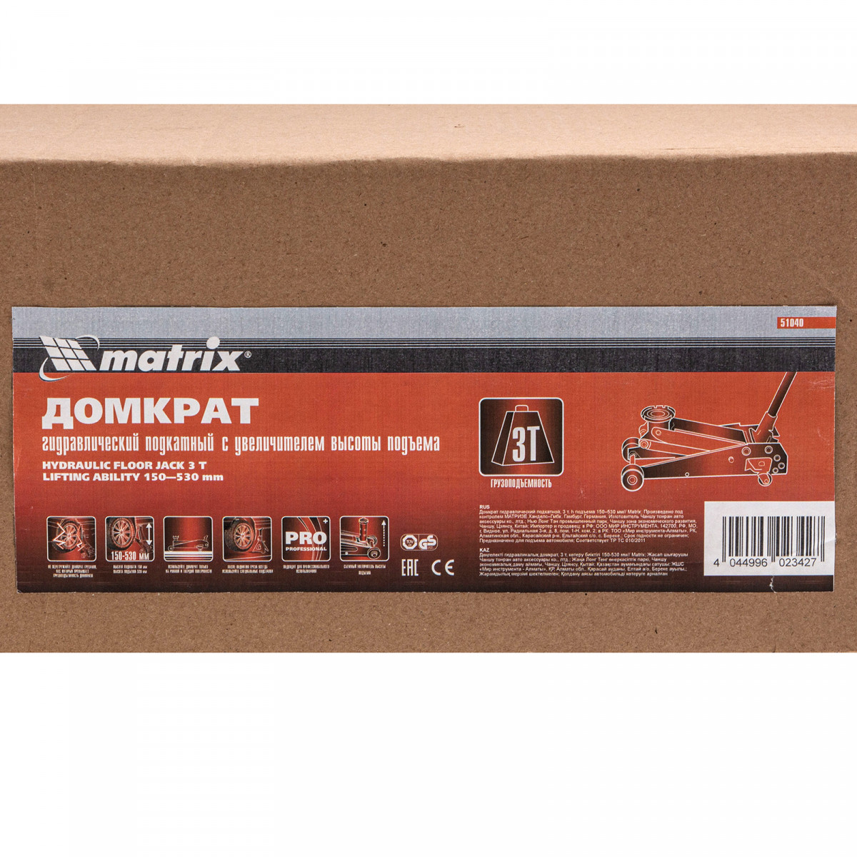 Домкрат гидравлический подкатной, 3 т, высота подъема 150-530 мм Matrix