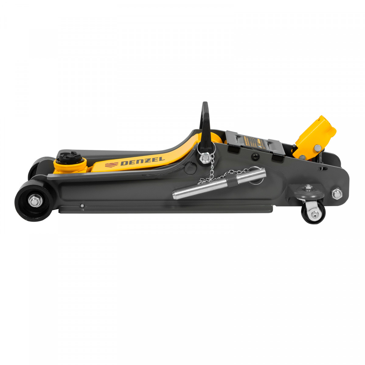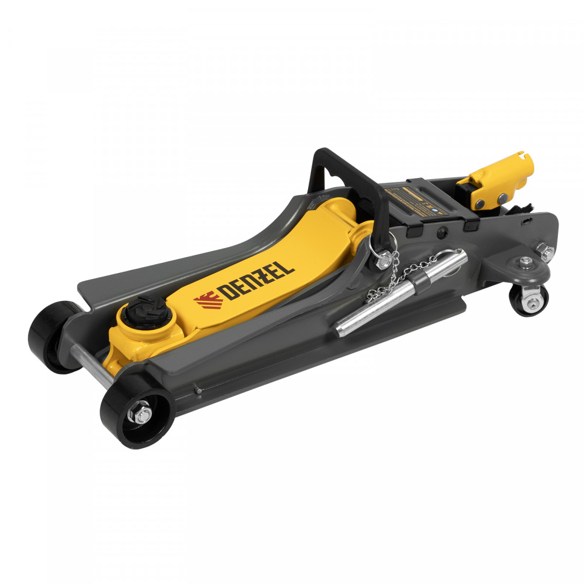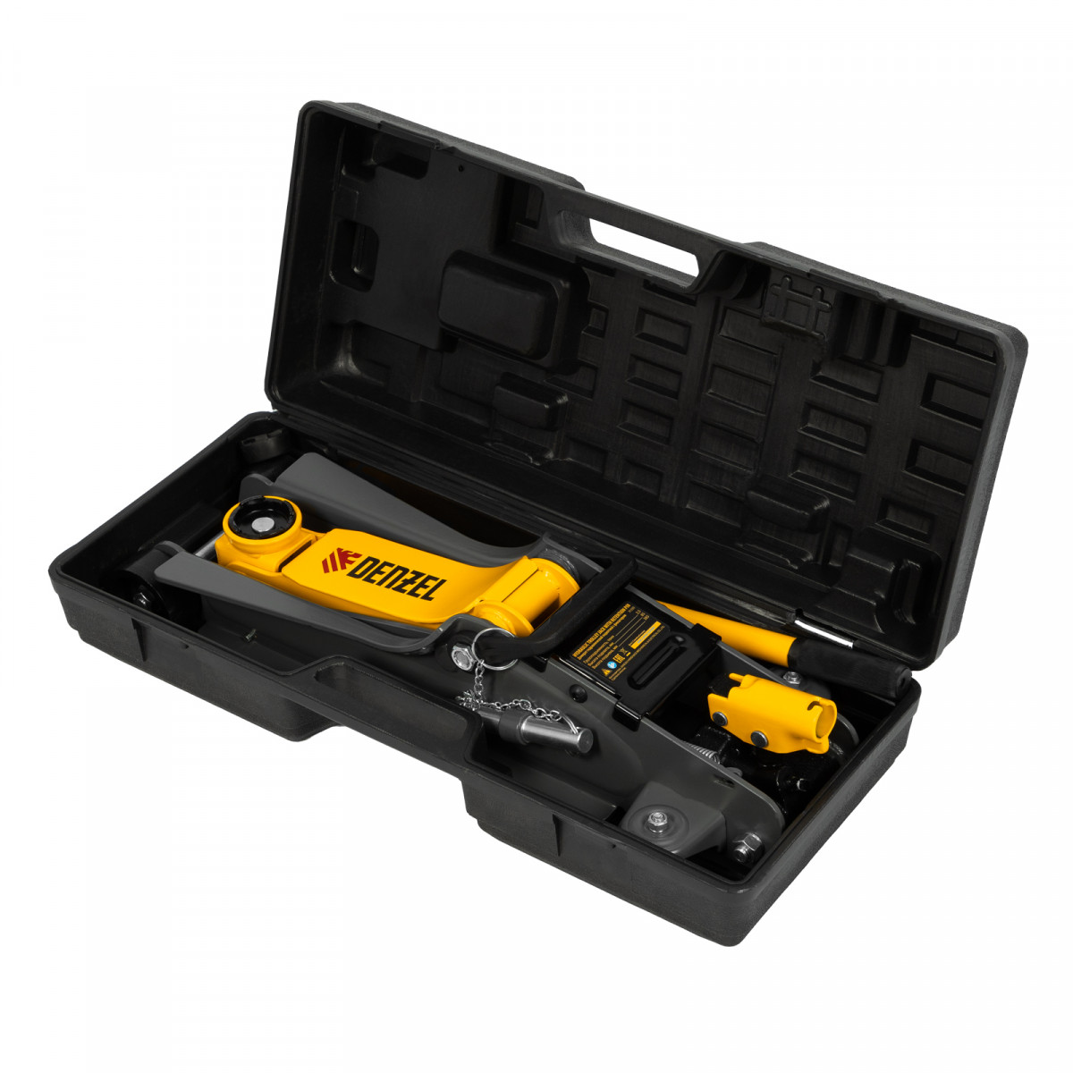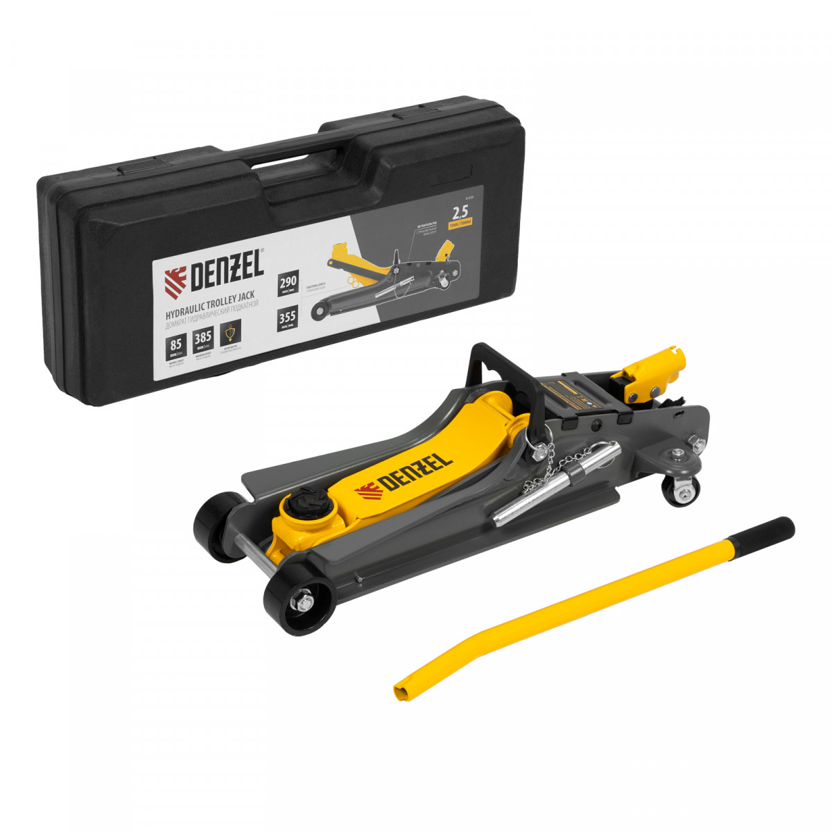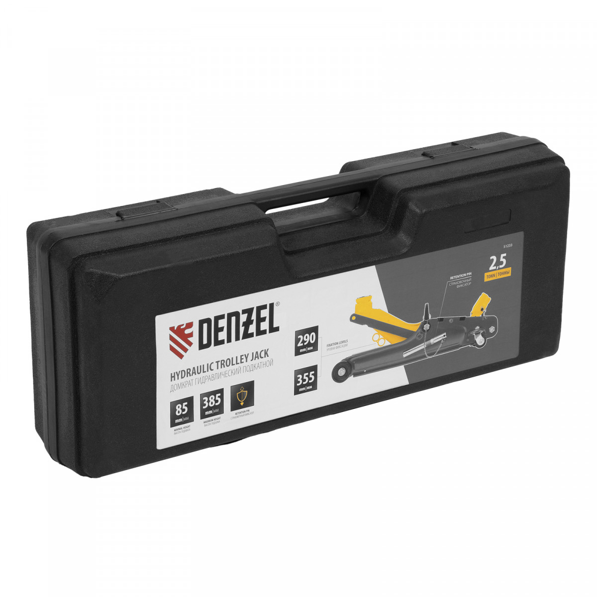 Домкрат гидравлический подкатной с фиксатором, 2,5 т, 85-385 мм, в пласт. кейсе Denzel