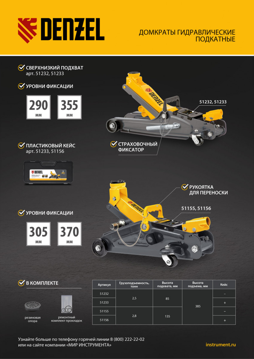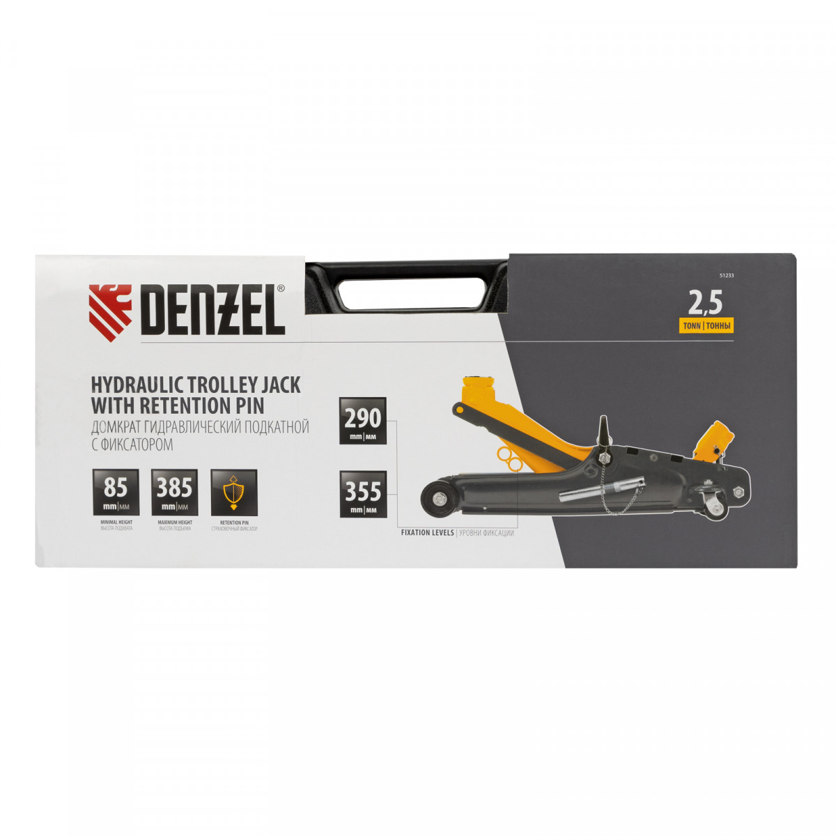 Гидравлический подкатной домкрат Denzel 51233 с фиксатором, поставляющийся в кейсе, имеет высоту подхвата 85 мм и предназначен для плавного подъема грузов массой до 2,5 т на высоту до 385 мм. Страховочный штифт позволяет фиксировать подъемный рычаг на высоте 290 и 355 мм для безопасной работы. Домкрат пригодится владельцам легковых автомобилей с низким и стандартным клиренсом.