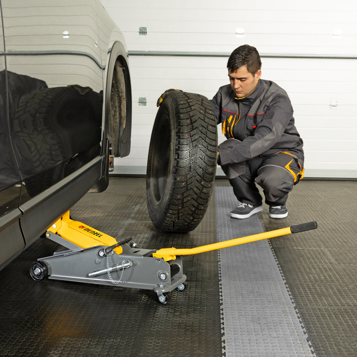 Гидравлический подкатной домкрат Denzel 51261 с фиксатором имеет высоту подхвата 190 мм и предназначен для плавного подъема грузов массой до 3 т (в том числе автомобилей класса SUV) на высоту до 532 мм. Страховочный штифт позволяет фиксировать подъемный рычаг на высоте 410 и 450 мм для безопасной работы. Домкрат пригодится владельцам легковых автомобилей со стандартным клиренсом.