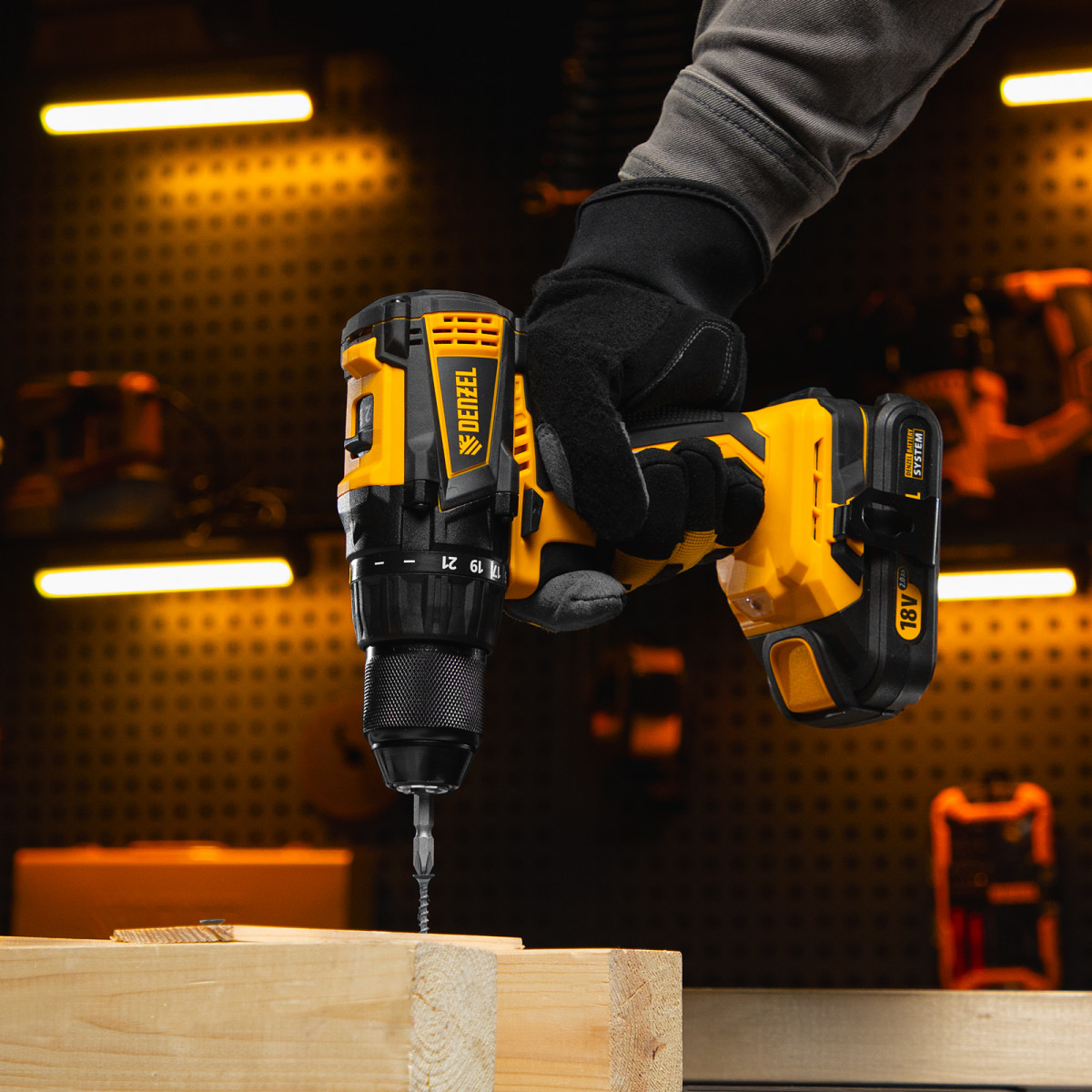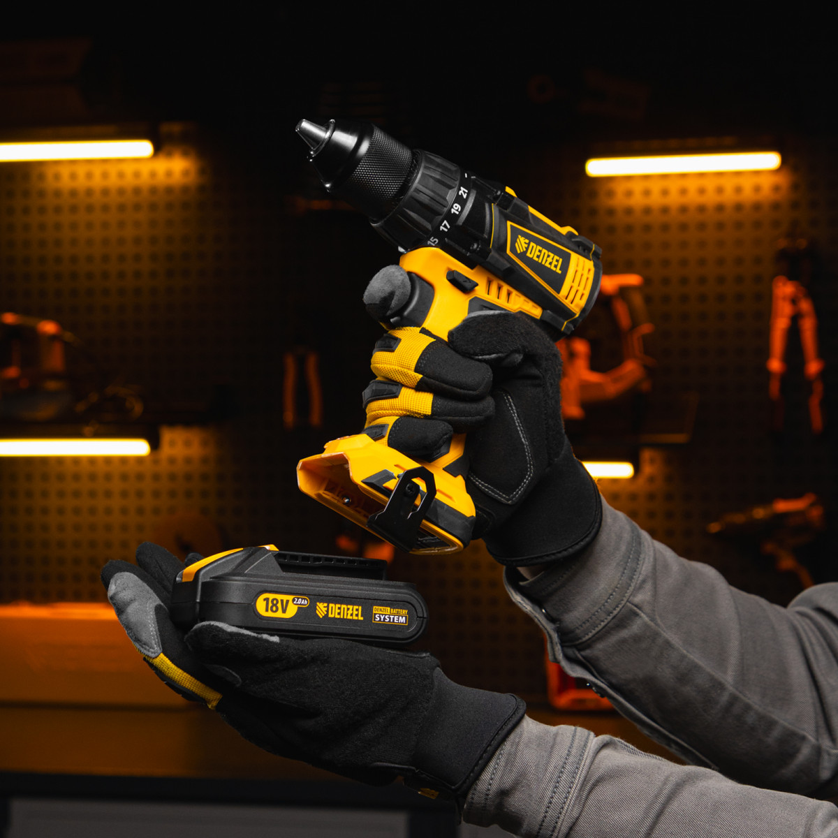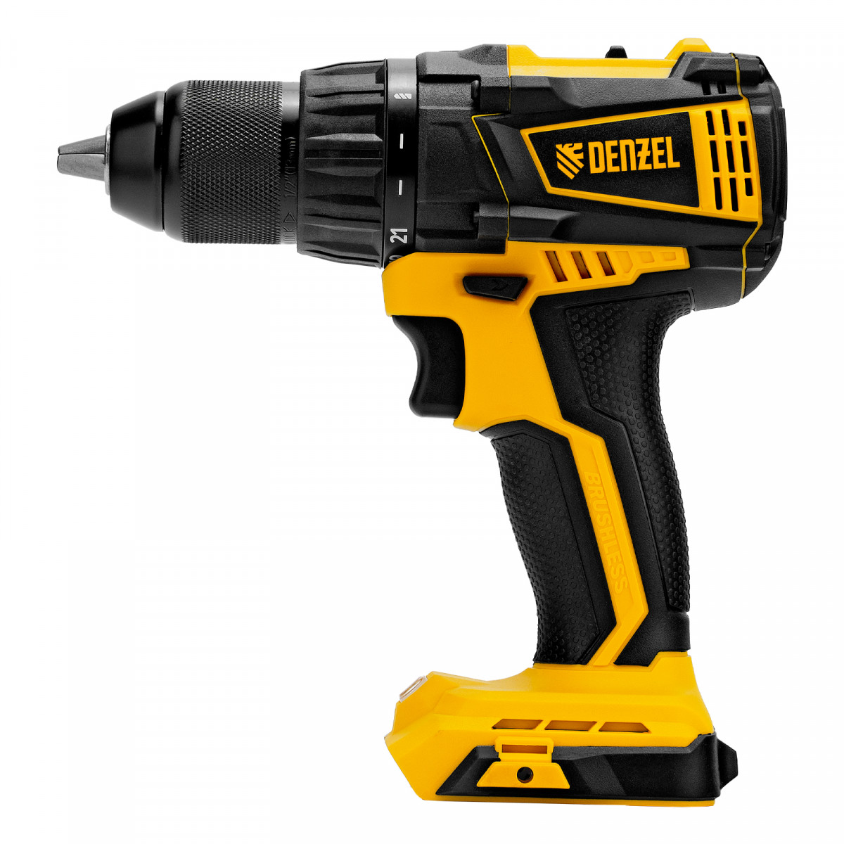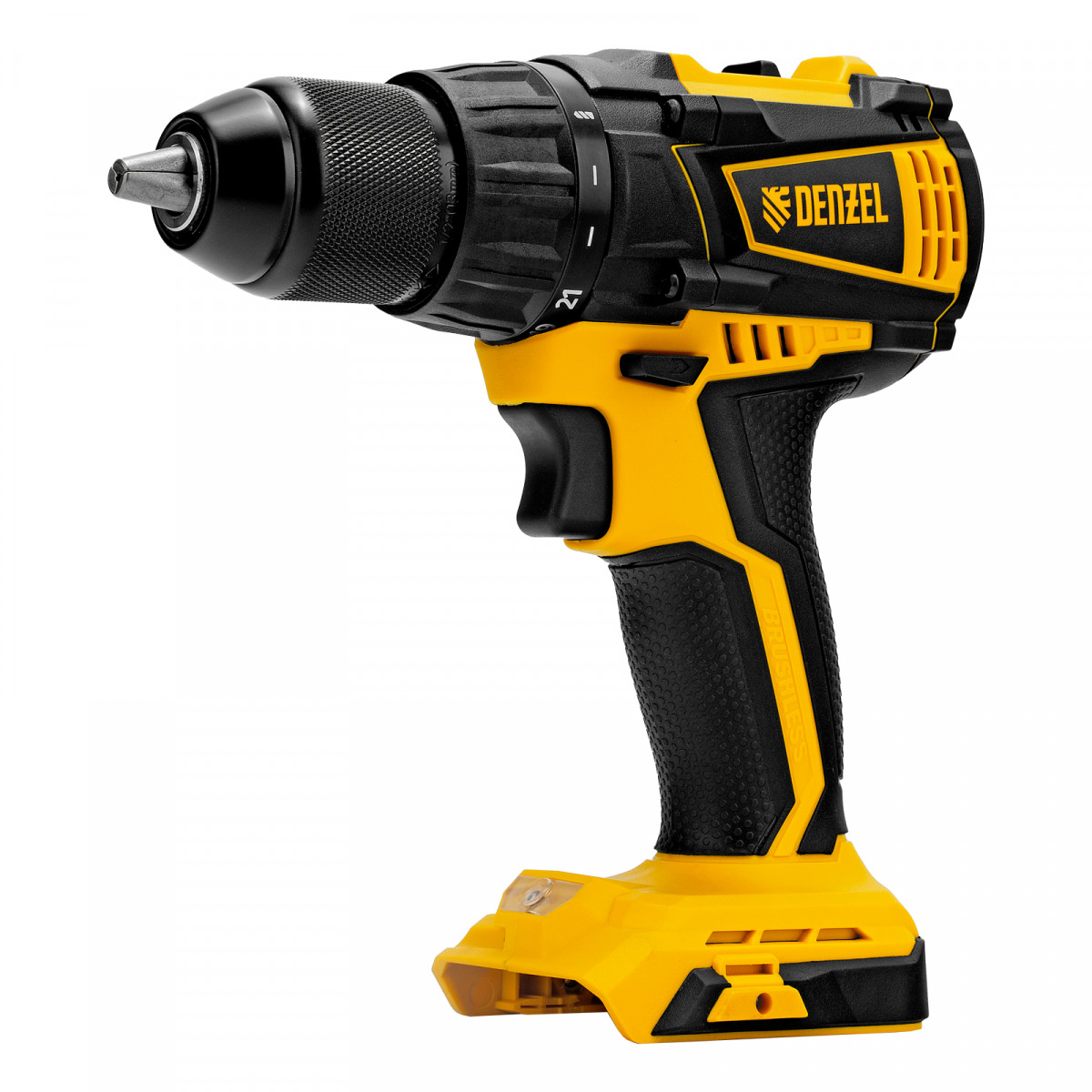- Универсальность — дрель-шуруповерт совместима с любым Li-Ion аккумулятором и зарядным устройством единой платформы Denzel Battery System 18V.