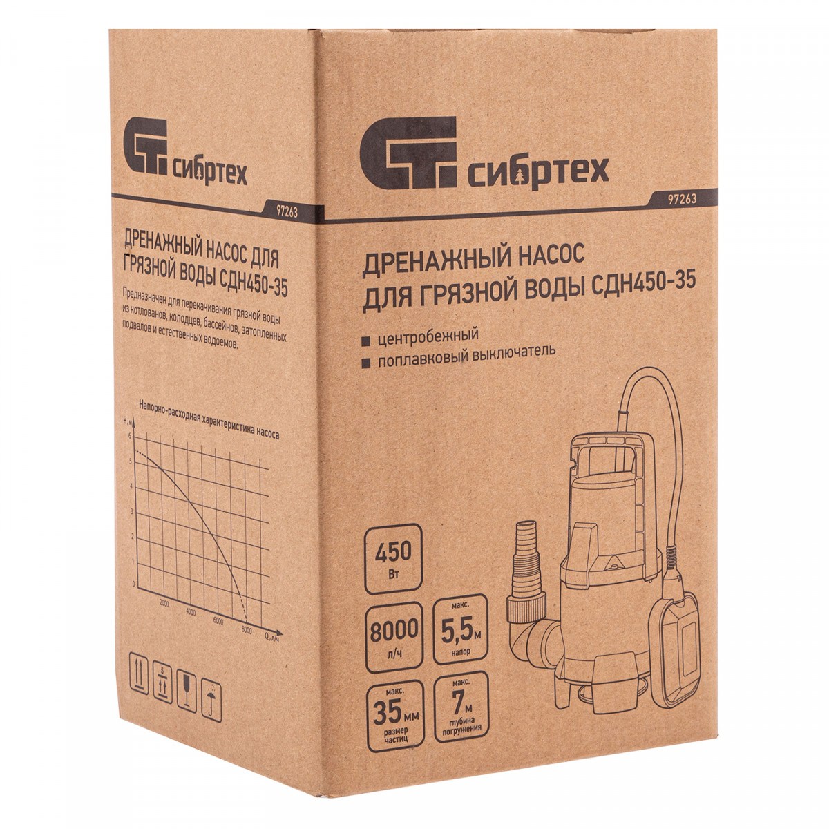 Дренажный насос для грязной воды СДН450-35, 450 Вт, напор 5.5 м, 8000 л/ч Сибртех
