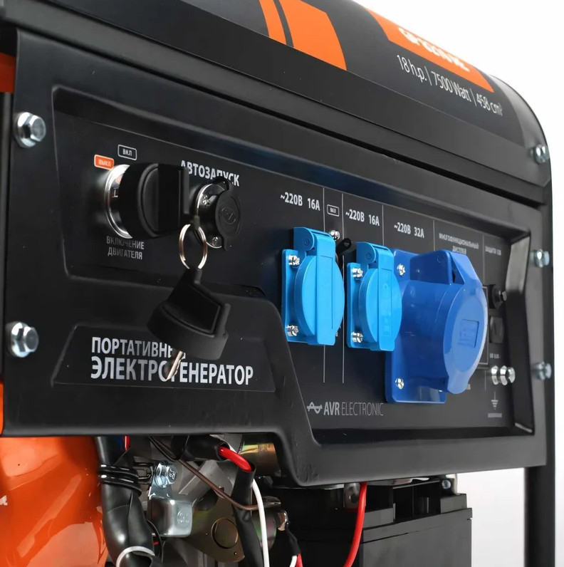 - Силовая розетка 32 А для снятия всей мощности генератора (силовая вилка 32 А в комплекте);