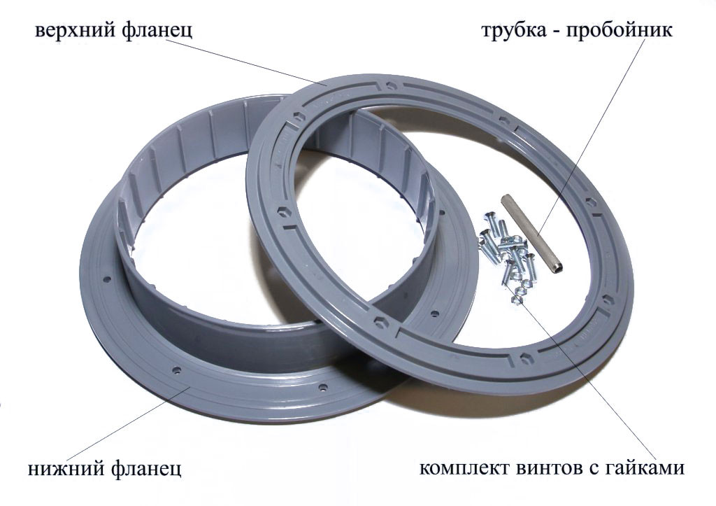 Фланцы представляют собой два литых диска из морозостойкого полипропилена с встречно смыкающимися плоскими поверхностями, на которых расположены кольцевые выступы, фиксирующие в сборе материал пола и надежно герметизирующие вырез под лунку. Нижний фланец имеет выступ, который образует кольцевой бортик с ребрами жесткости.
