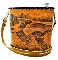 Фляжка (600мл) из нержавеющей стали, обшитая натуральной кожей, с художественным оформлением.