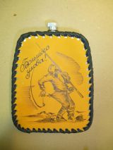 Фляжка из нержавеющей стали, обшитая натуральной кожей, с художественным оформлением.