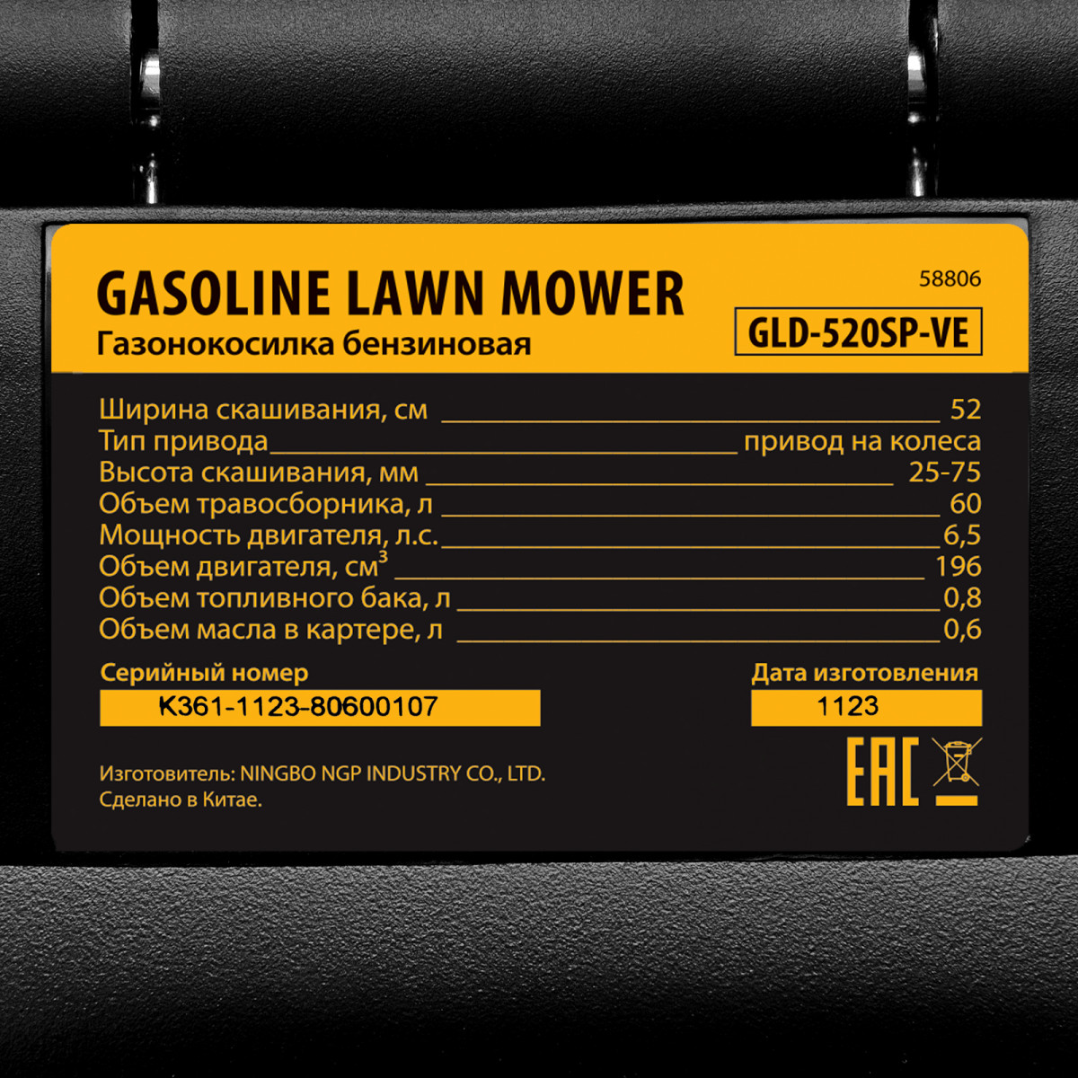 Газонокосилка бензиновая GLD-520SP-VE, 196 см3, ширина 52 см, привод, вариатор, электрический старт, 60 л Denzel