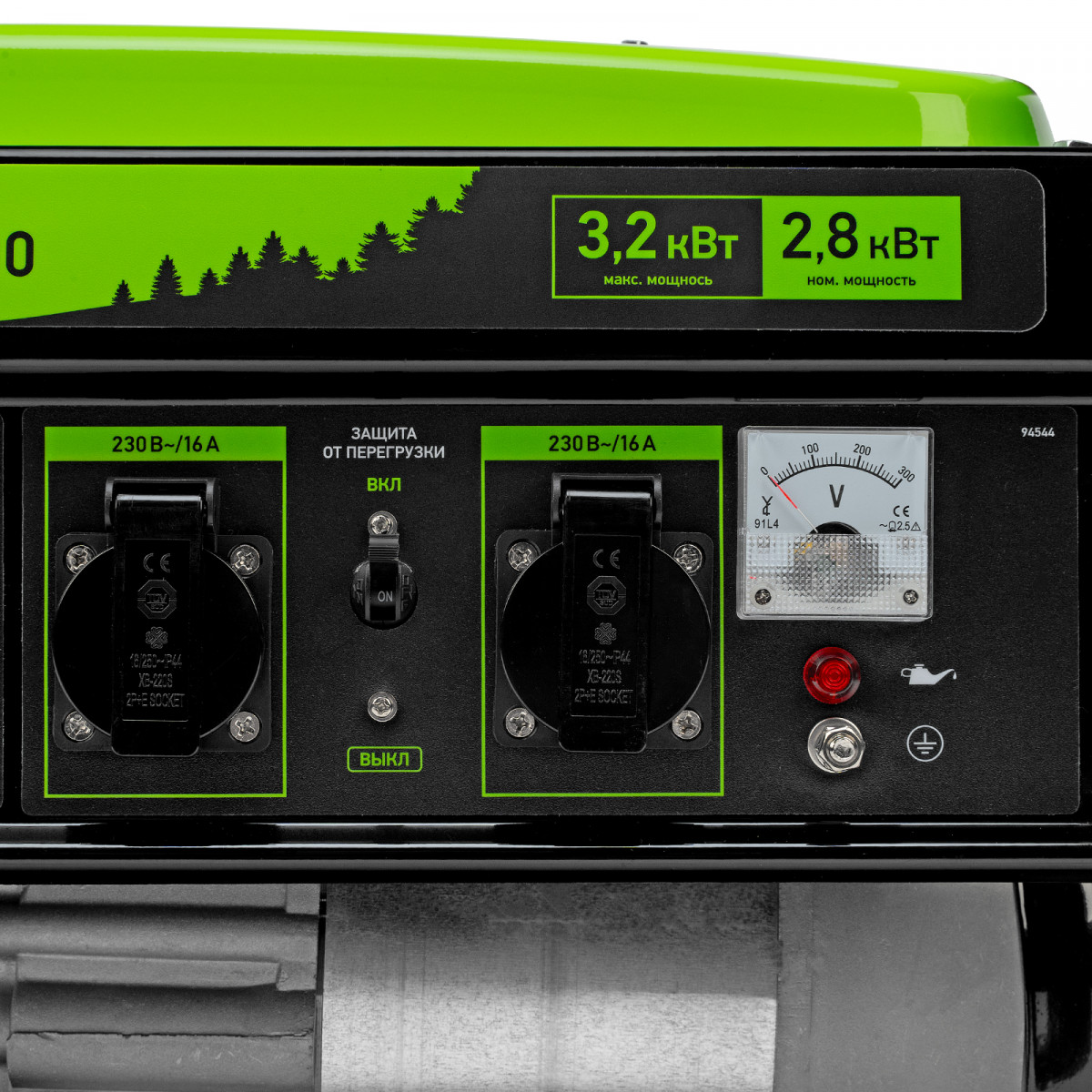 • Контроль рабочих параметров — встроенный вольтметр позволяет отслеживать напряжение в сети, а топливный индикатор — уровень бензина в баке.