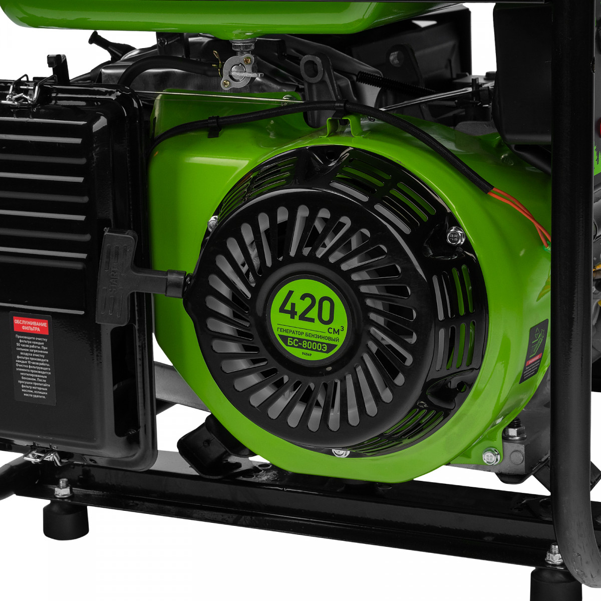 Бензиновый генератор Сибртех БС-8000Э 94549 мощностью 6,6 кВт, с 4-тактным двигателем, электростартером и баком объемом 25 л, выдает напряжение 230 В и является самым производительным в линейке. Подойдет для дачи, строительной площадки, мастерской, гаража или магазина. Благодаря мощности 6,6 кВт и наличию силовой розетки способен обеспечить бесперебойную работу нескольких потребителей одновременно, например, электрической плиты, холодильника, 5 ламп накаливания. Электростартер облегчает запуск — для начала работы достаточно просто повернуть ключ.