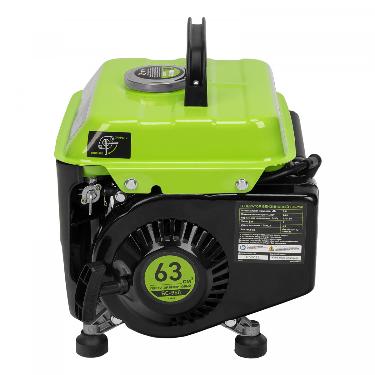 Бензиновый генератор Сибртех БС-950 94665 на 230 В, мощностью 0,8 кВТ, с 2-тактным двигателем и ручным стартером, с баком объемом 4 л, отличается небольшими габаритами, что делает его незаменимым на природе, на рыбалке, на даче или в гараже. Мощности 0,8 кВт достаточно для подключения электроинструмента или приборов с небольшим уровнем потребления энергии. На одной заправке генератор способен проработать до 4 часов.