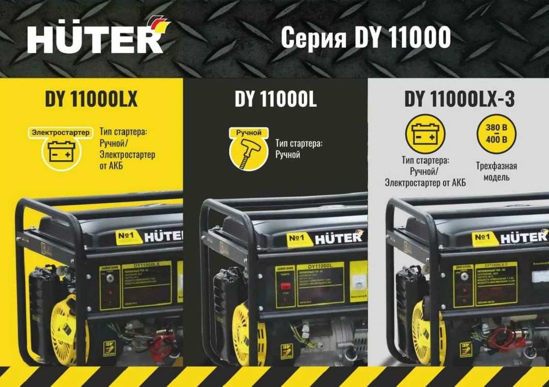 - Бензиновая электростанция Huter DY11000LX-3 оборудована мощным одноцилиндровым четырёхтактным двигателем внутреннего сгорания, мощностью 19 лс