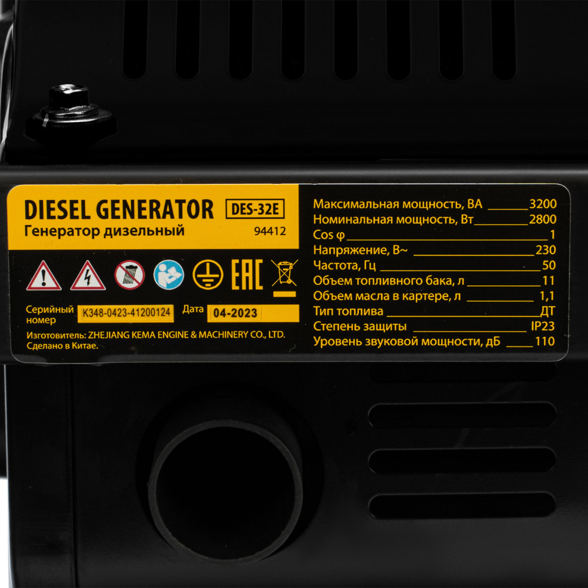 Генератор дизельный DES-32E, 3,2 кВт, 230 В, 11 л, электростартер Denzel