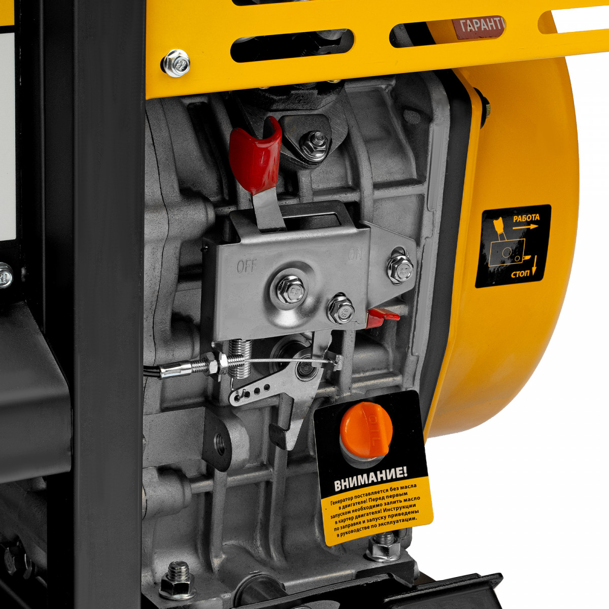 • Защита двигателя — генератор не запустится при недостаточном уровне масла в картере, фильтры препятствуют попаданию твердых частиц в цилиндры, а также посторонних примесей в топливо.