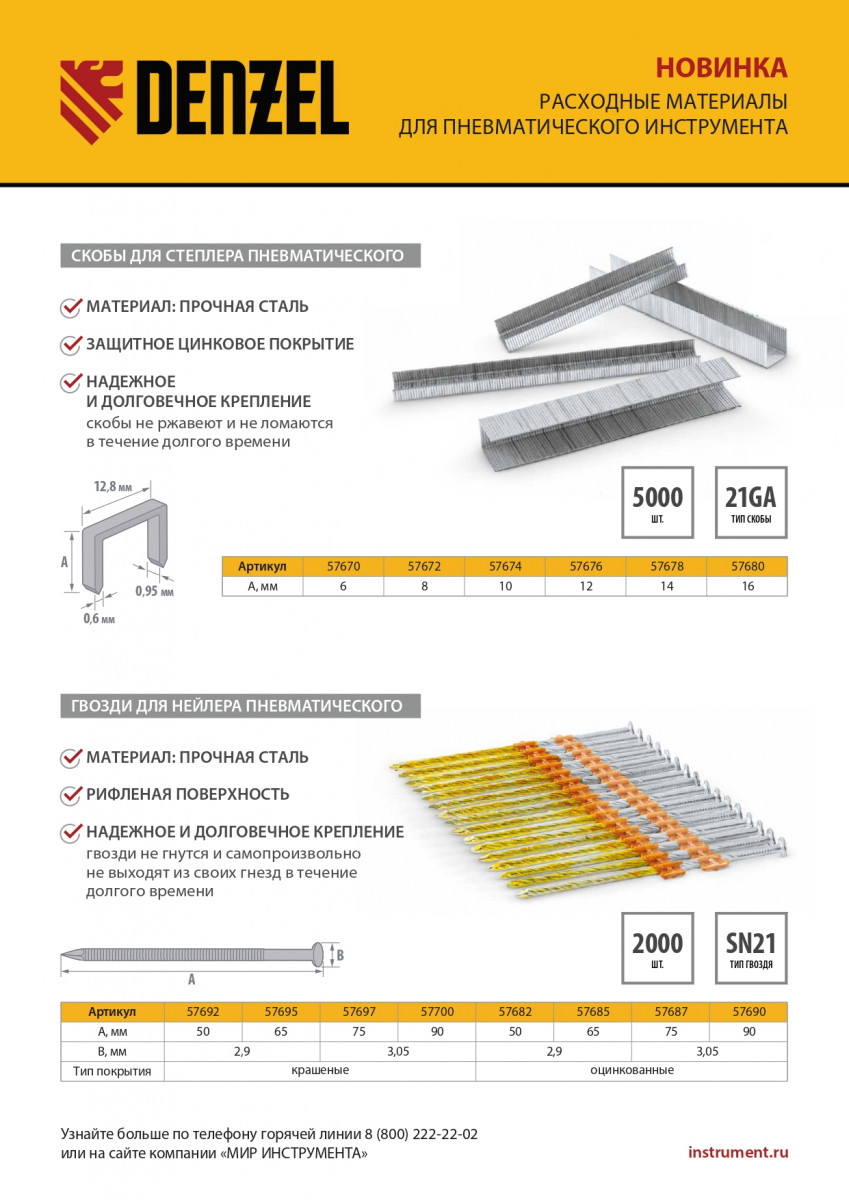 Гвозди Denzel 57697 типа SN21, длиной 75 мм и диаметром 3,05 мм, с крашеной поверхностью, 2000 шт. в упаковке, — расходники для пневматического нейлера. Используются для скрепления различных материалов, будут полезны во время сборочных и отделочных работ.