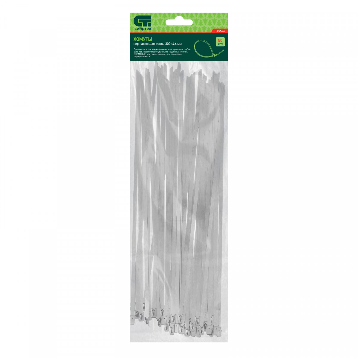 Хомуты Сибртех 45596 из нержавеющей стали, размером 300 х 4,6 мм, 50 шт. в упаковке, предназначены для стяжки и закрепления проводов, жгутов, трубок и шлангов. Пригодятся во время монтажа электросетей, а также будут полезны дома, на даче или в гараже.