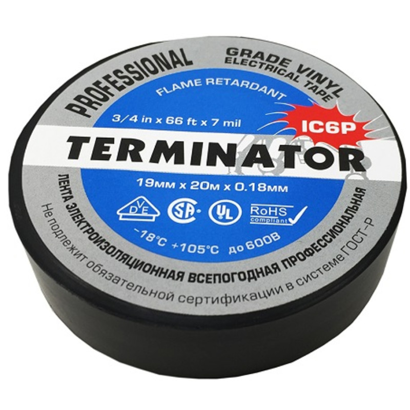 Изолента Terminator. Прекрасно подойдет как в ремонте автомобиля так и в быту. Изолента супер премиум класса, холодостойкая, огнеупорная, самозатухающая на ПВХ основе. Стойкая к воздействию агрессивных жидкостей и масел. Изолента Terminator ICP6 применяется для изготовления пучков кабелей (жгутования). Толщина 0,18 мм, ширина 19 мм, длина 20 м.