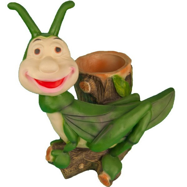 Декоративное фигурное кашпо для цветов выполнено в виде зеленого кузнечика, сидящего на ветке. Кашпо отлично дополнит экстерьер любого дачного участка и прекрасно поднимет настроение.