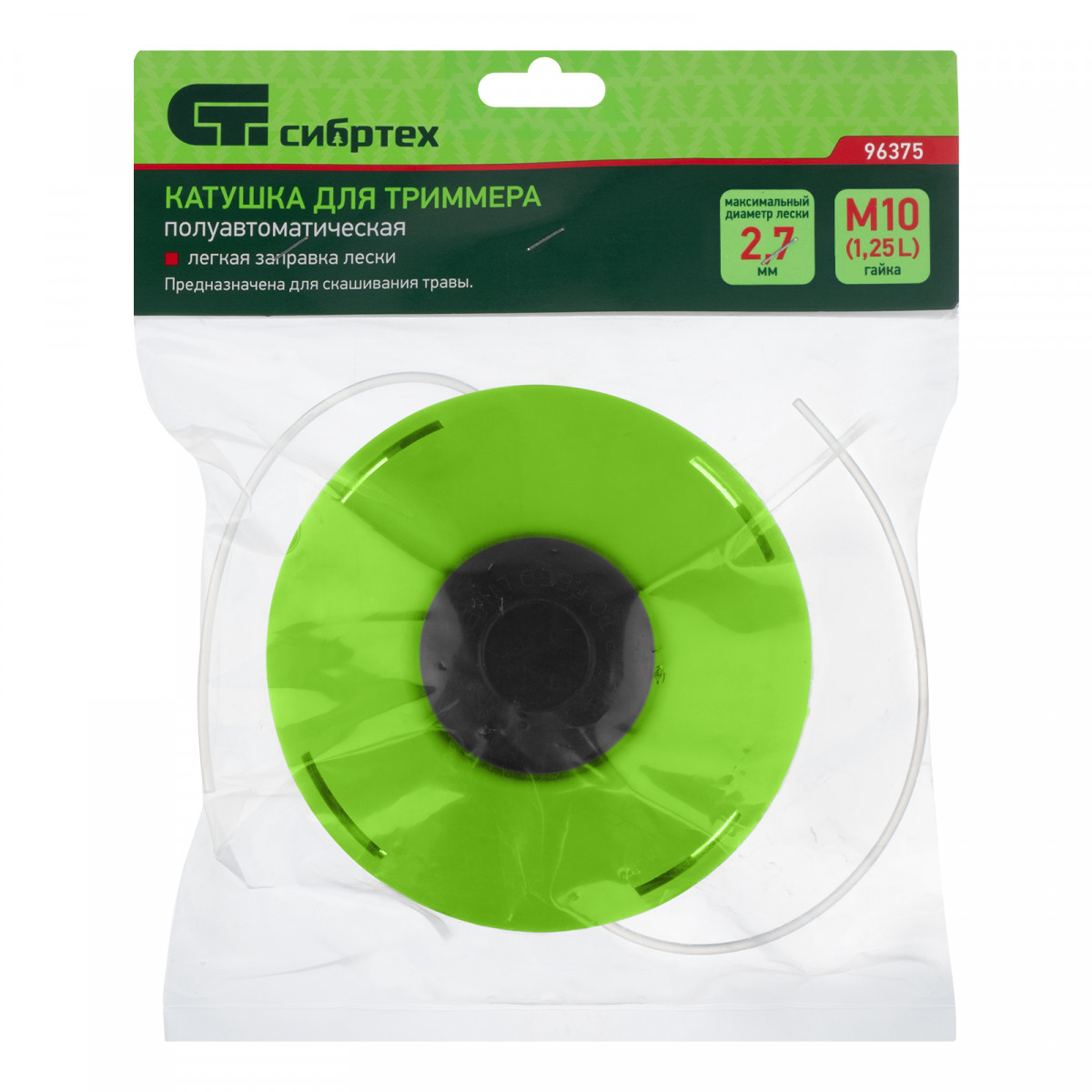 Полуавтоматическая катушка Сибртех 96375 с легкой заправкой лески крепится на вал бензинового или электрического триммера при помощи гайки М10 х 1,25 мм с левой резьбой. Заправляется леской диаметром до 2,7 мм, что позволяет использовать ее для подравнивания газона и скашивания сорняков. Катушка пригодится владельцам загородных участков.