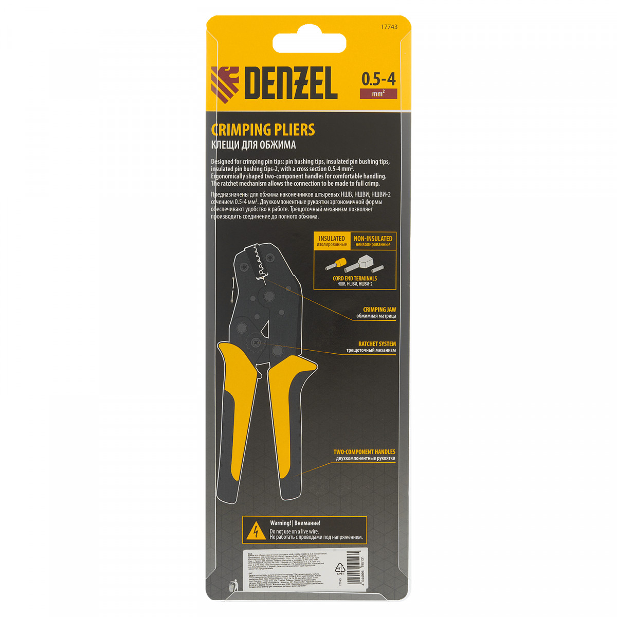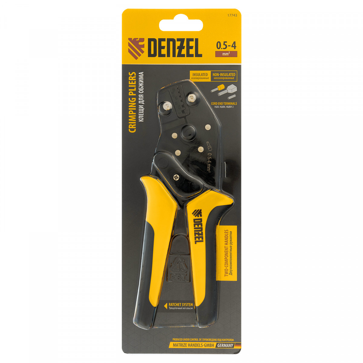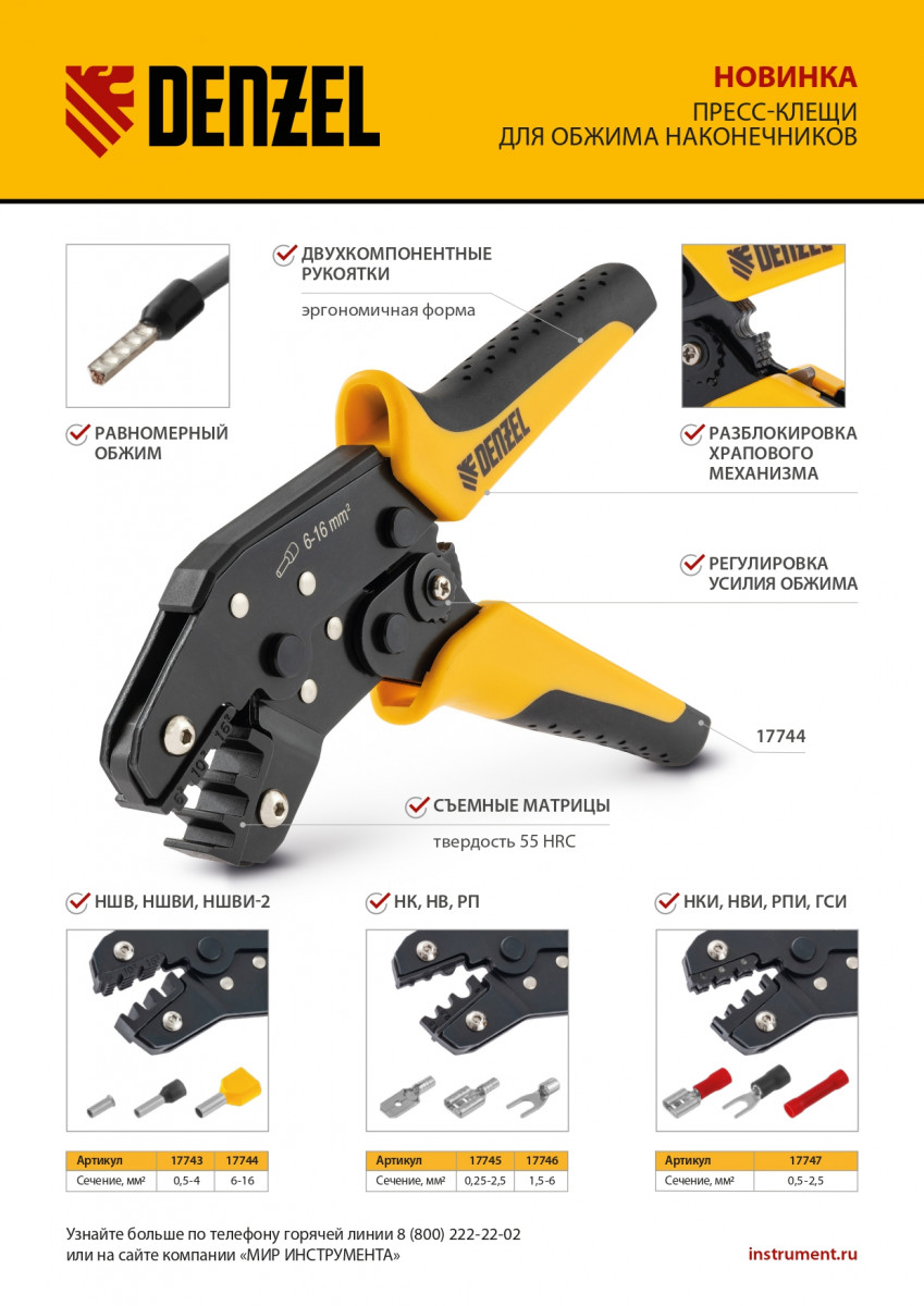 Клещи Denzel 17743 предназначены для обжима наконечников штыревых втулочных НШВ, НШВИ, НШВИ-2 сечением 0,5-4 мм². Двухрычажная передача силы сжатия позволяет увеличить эффективность работы без дополнительных усилий мастера. Инструмент пригодится частным и профессиональным мастерам при проведении электромонтажных работ.