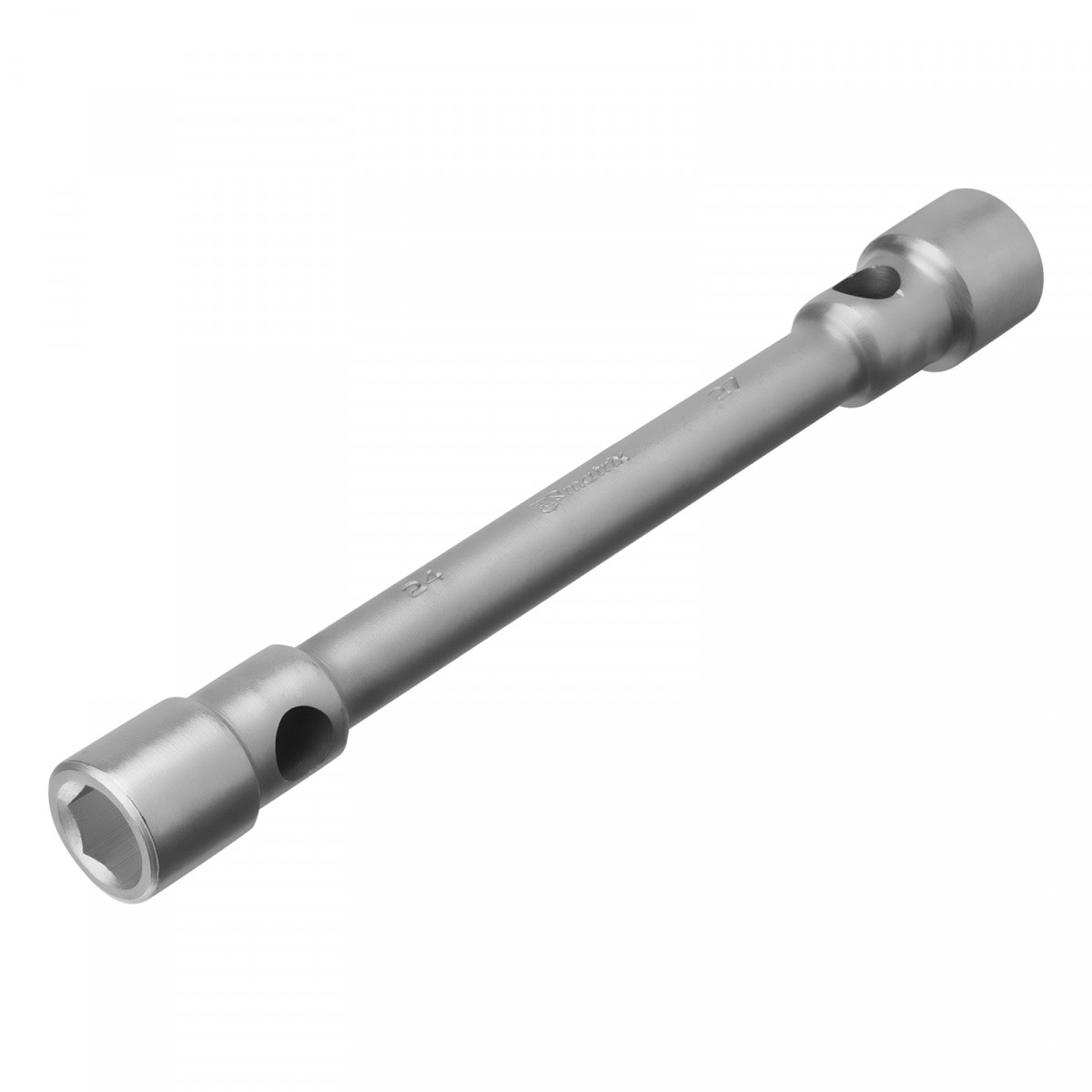 Двухсторонний баллонный ключ Matrix 14295, 24 х 27 мм, толщиной 26 мм и длиной 350 мм, используется для шиномонтажных работ на грузовом транспорте и автобусах. Две несъемные торцевые шестигранные головки подходят под крепеж 24 и 27 мм. Инструмент применяется на станциях техобслуживания.
